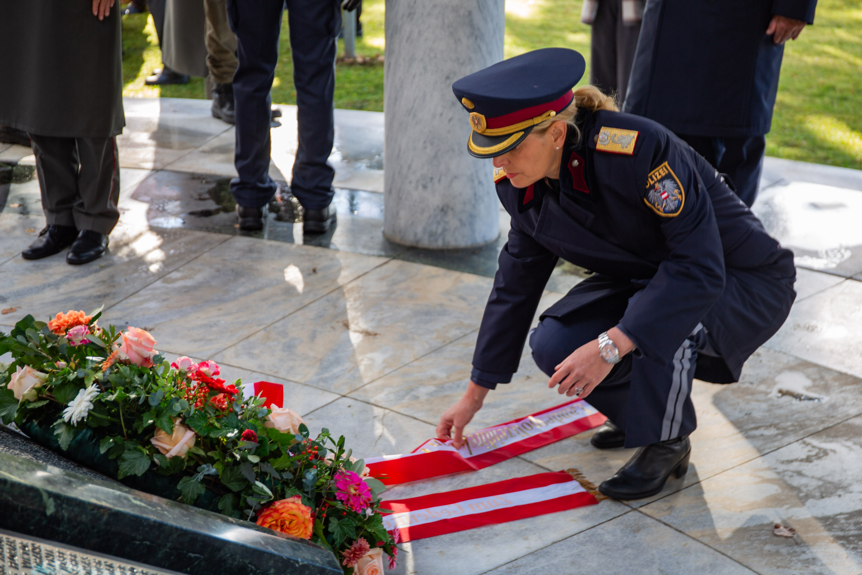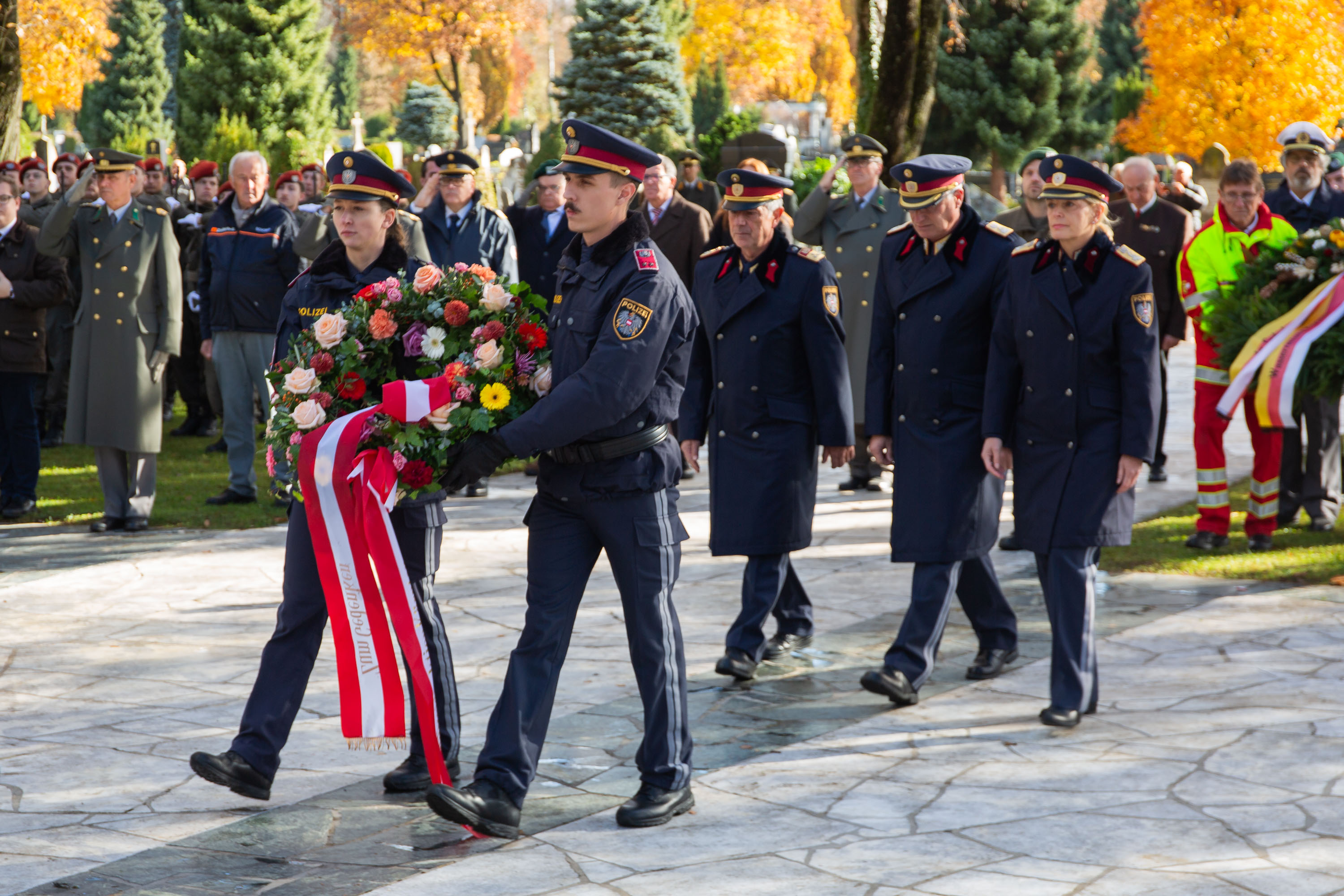 Bei der traditionellen Allerseelenfeier des Militärs, welche heuer am 3. November am Soldatenfriedhof Klagenfurt-Annabichl stattfand, wurde auch von der Exekutive zum Zeichen des Gedenkens ein Kranz niedergelegt. Daran nahmen Landespolizeidirektorin Michaela Kohlweiß, ihr Stellvertreter Generalmajor Arthur Lamprecht, sowie der Stadtpolizeikommandant von Klagenfurt/WS, Oberst Hans-Peter Mailänder, teil.