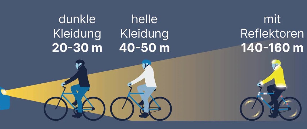 Die dunkle Hose kombiniert mit der schicken schwarzen Jacke – was modisch "up to date" ist, trägt leider nicht immer dazu bei, dass man als Fußgänger, Rad- oder Scooterfahrer im Straßenverkehr leichter und schneller erkannt wird. Regen und Nebel verschärfen die Situation zusätzlich. Um (lebens-) gefährliche Situationen zu vermeiden, sollten dunkle Kleidungsstücke zumindest mit einem Reflektorband oder einem Reflektorgurt kombiniert werden. Noch besser ist es, wenn über der Kleidung zusätzlich eine Warnweste getragen wird – diese macht Sie weithin sichtbar. Beim Fahrrad oder dem Scooter gilt: Ohne Licht geht es nicht!