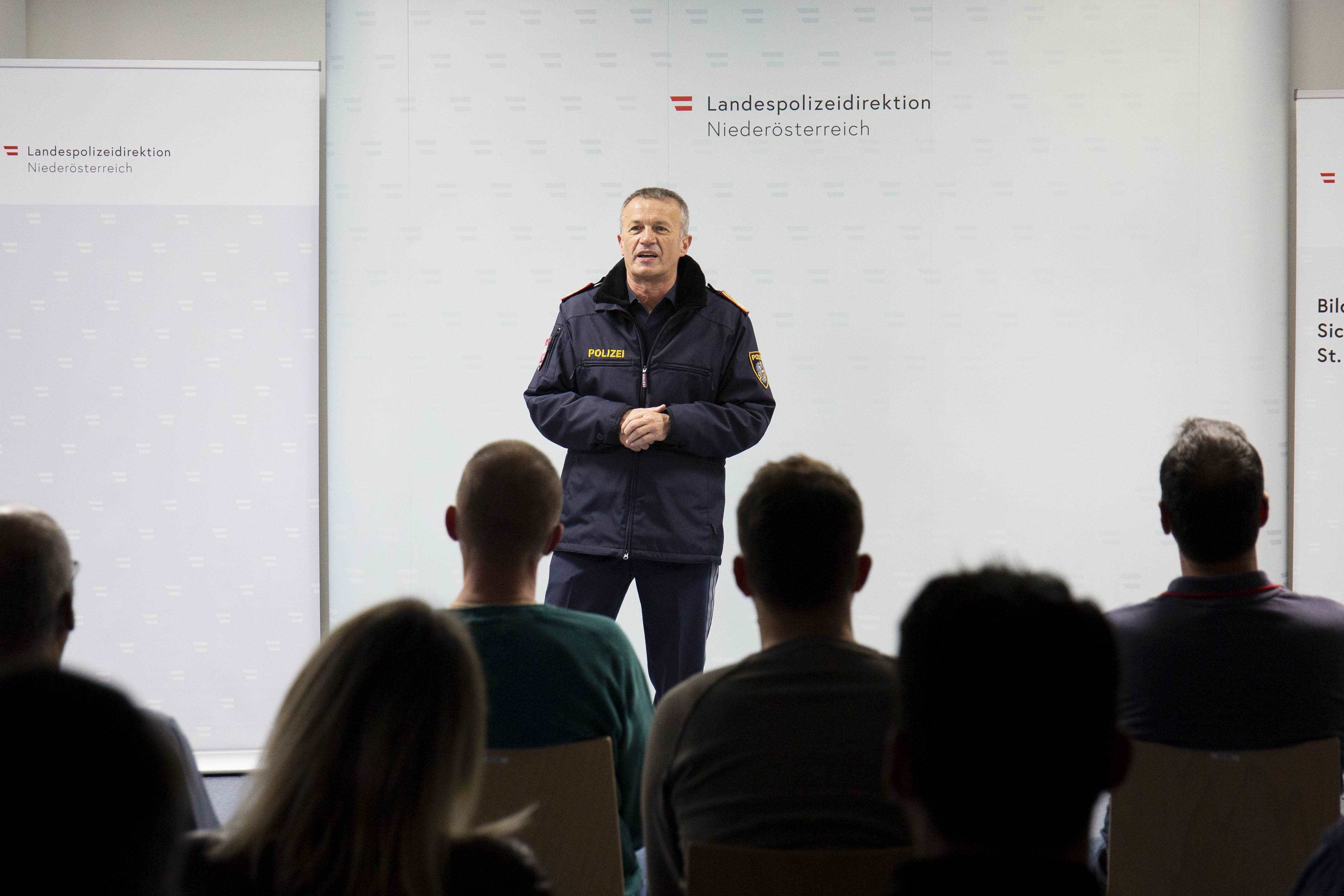 Nach Abschluss der Fachausbildung überreichte der Landespolizeidirektor Franz Popp, BA MA in Anwesenheit der Leiterin des Büros Öffentlichkeitsarbeit und interner Betrieb Hofrätin Mag.a Sonja Stamminger, BA, dem Leiter der Personalabteilung Oberst Peter Gessner sowie des Leiters des Bildungszentrums Oberst Günter Gassner, BA MA und weiteren Vertretern des Bildungszentrums St. Pöltens die Zertifikate an die Teilnehmerinnen und Teilnehmer.