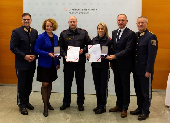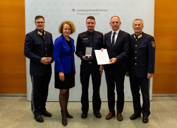 Das silberne Verdienstzeichen der Republik Österreich wurde verliehen an GrInsp Andreas Schaumüller der Polizeiinspektion Spitz/Donau, GrInsp Manfred Schleifer der Polizeiinspektion St. Pölten Spratzern, GrInsp Johannes Spreitzhofer des Stadtpolizeikommandos St. Pölten und GrInsp Christian Vecera der Polizeiinspektion Haugsdorf.