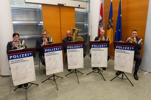 Bundesminister für Inneres Mag. Gerhard Karner, Landesrätin Maga. Christiane Teschl-Hofmeister, Landespolizeidirektor Franz Popp, BA MA und sein Stellvertreter Oberrat Mag.iur. Johannes Peham, zeichneten Polizeibedienstete des Aktiv- und Ruhestandes aus. Musikalisch umrahmt wurde die Veranstaltung durch das Quintett der Polizeimusik Niederösterreich unter der Leitung von Kapellmeister Franz Herzog.