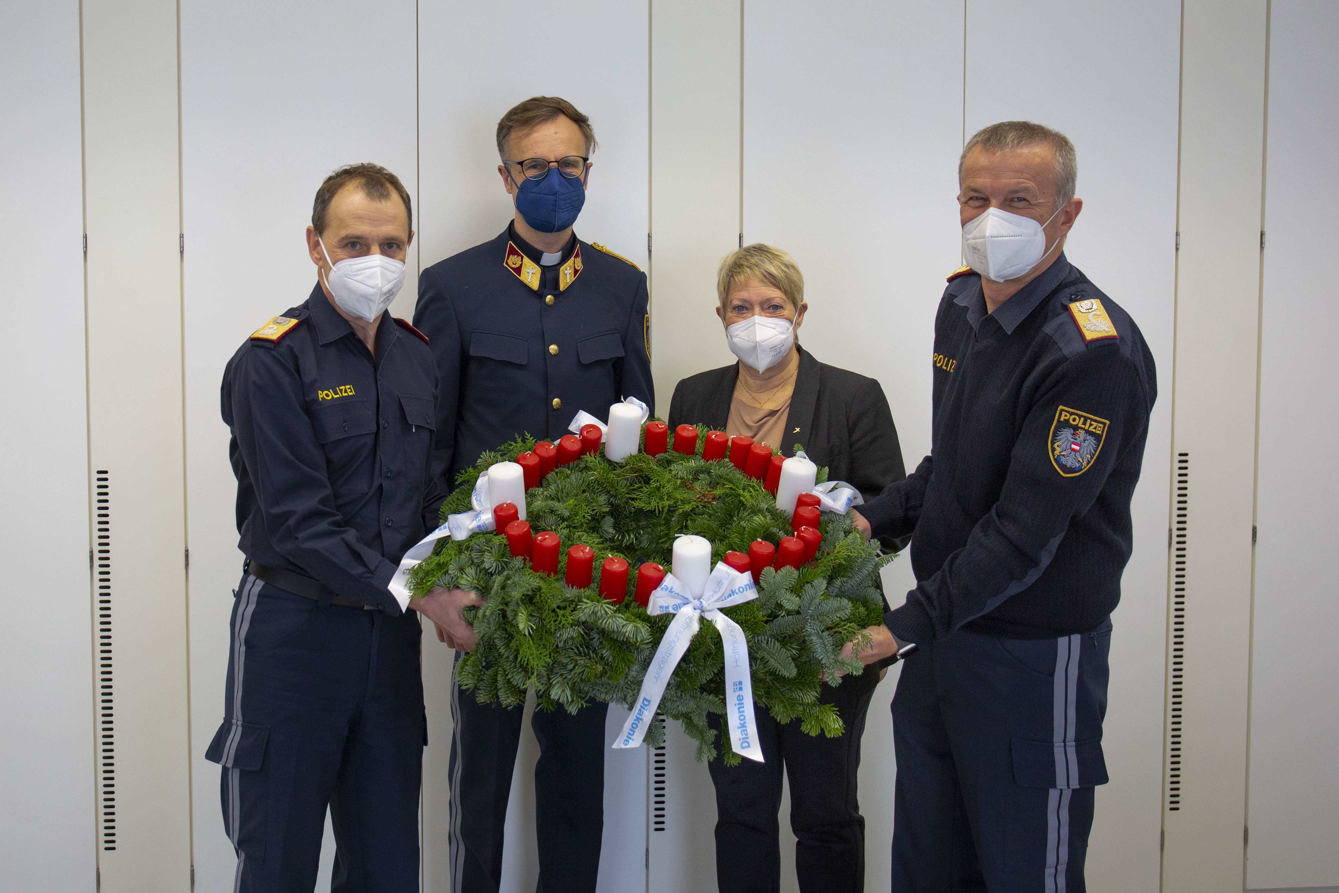 Bei diesem Arbeitsbesuch übergaben die beiden dem Landespolizeidirektor Franz Popp, BA MA, einen Adventkranz. Er soll in der Landespolizeidirektion als Zeichen für die Vorweihnachtszeit, in diesen herausfordernden Zeiten, sein Licht spenden.