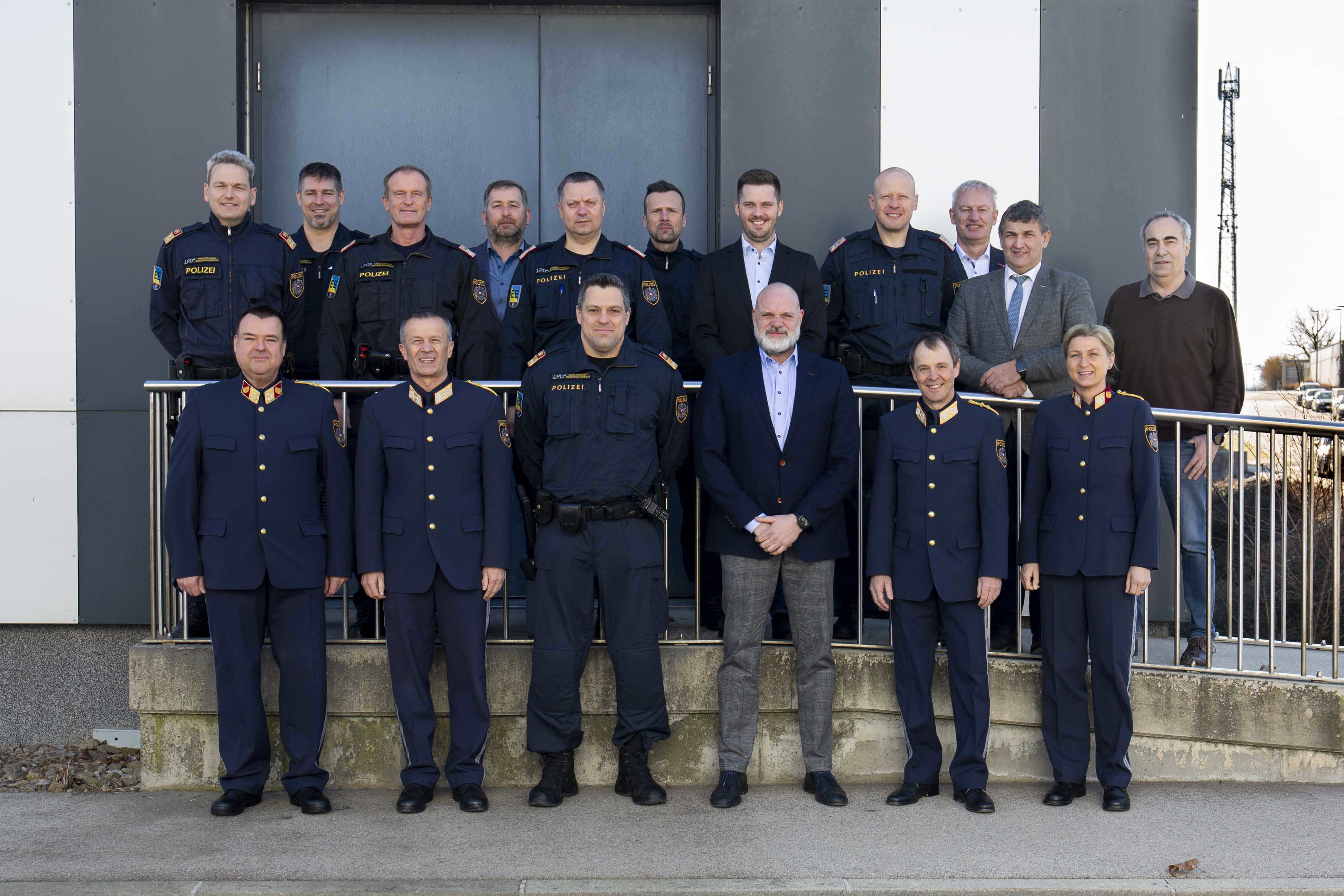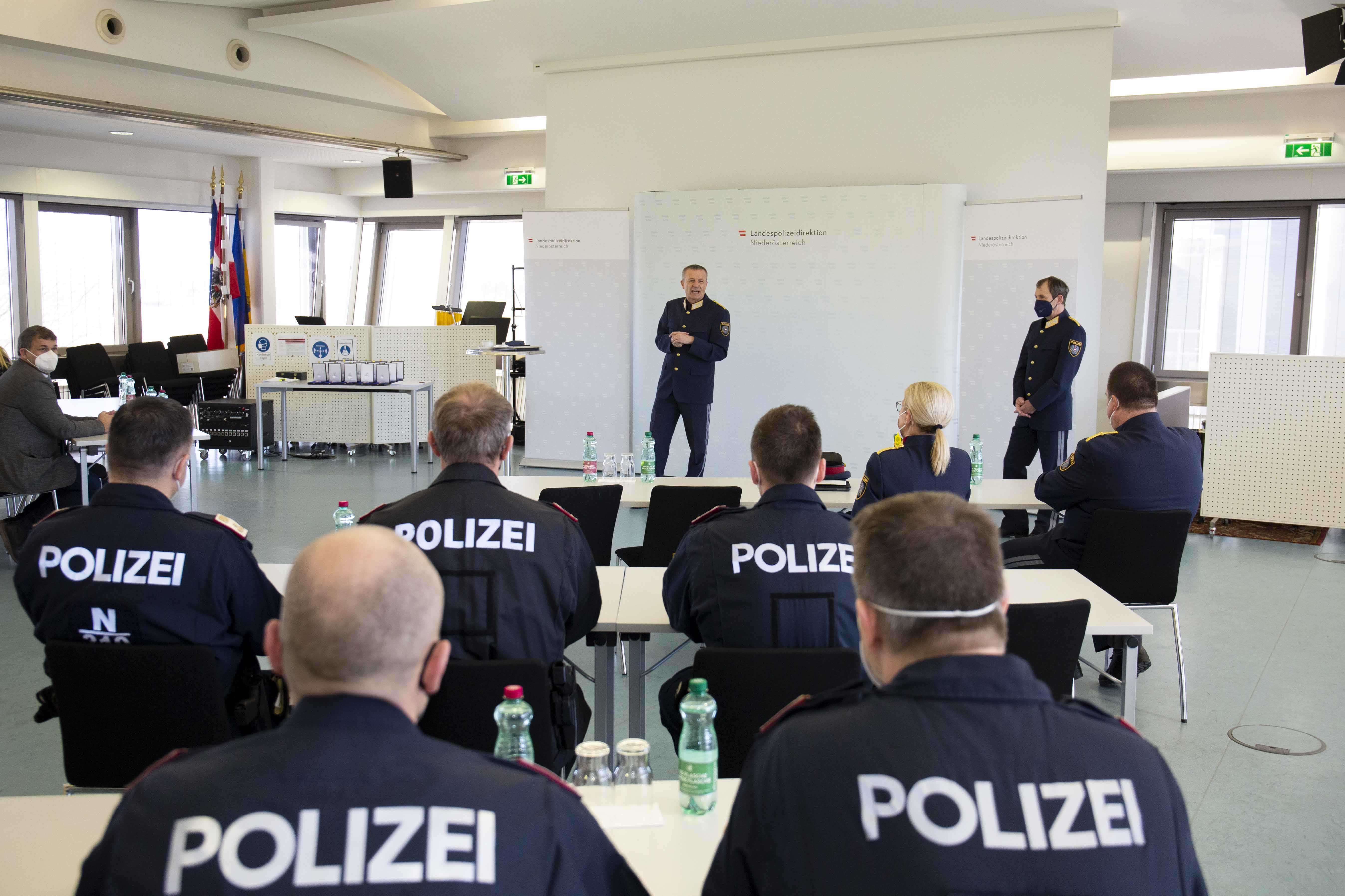 Oberst Gessner, Direktor Popp, BA MA, GenMjr Mag. iur. Aichberger und HR Mag. Stamminger, BA mit beim Terroranschlag eingesetzten Bediensteten der LPD NÖ
