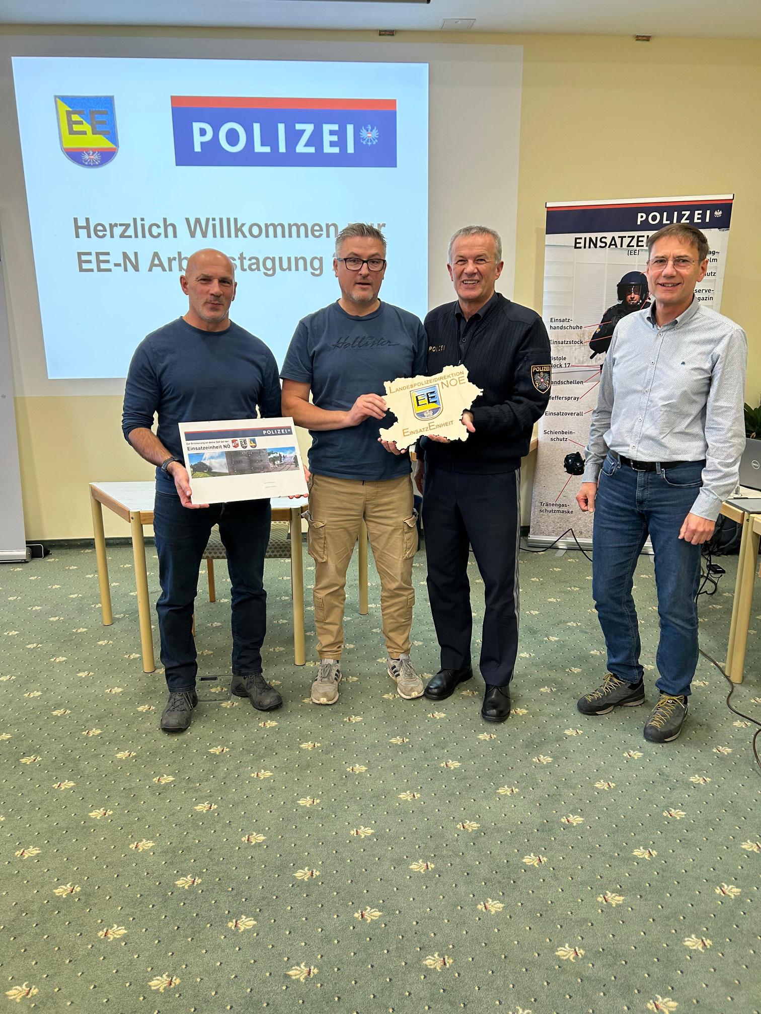 Landespolizeidirektor Franz POPP, BA MA überreichte im Beisein von Oberst Andreas POLASCHEK, BA und Obstlt Gerhard PICHLER, BA Ehrengeschenke an die beiden Kollegen.