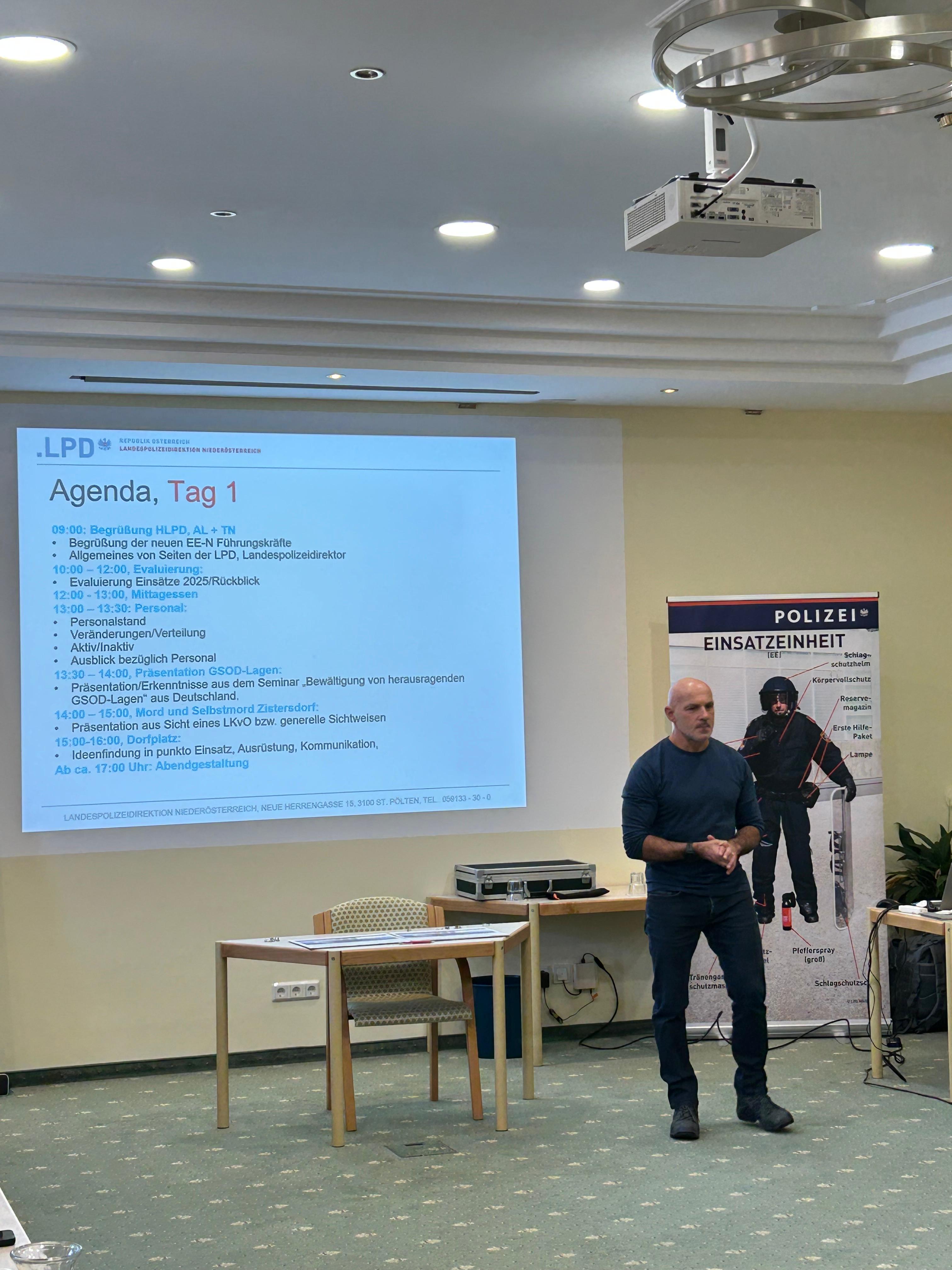 Nach der Mittagspause erfolgte durch Obstlt Florian GRÜNSTEIDL, BA MA eine kurze Präsentation über das Spezialseminar ‘Bewältigung von herausragenden GSOD-Lagen‘. Obstlt Florian GRÜNSTEIDL, BA MA, Obstlt Philipp HAROLD, BA und Mjr Bernhard BIRKHAHN, BA MA nahmen im Oktober an diesem Seminar in Deutschland beim Fortbildungsinstitut der Bayerischen Polizei in Ainring teil.