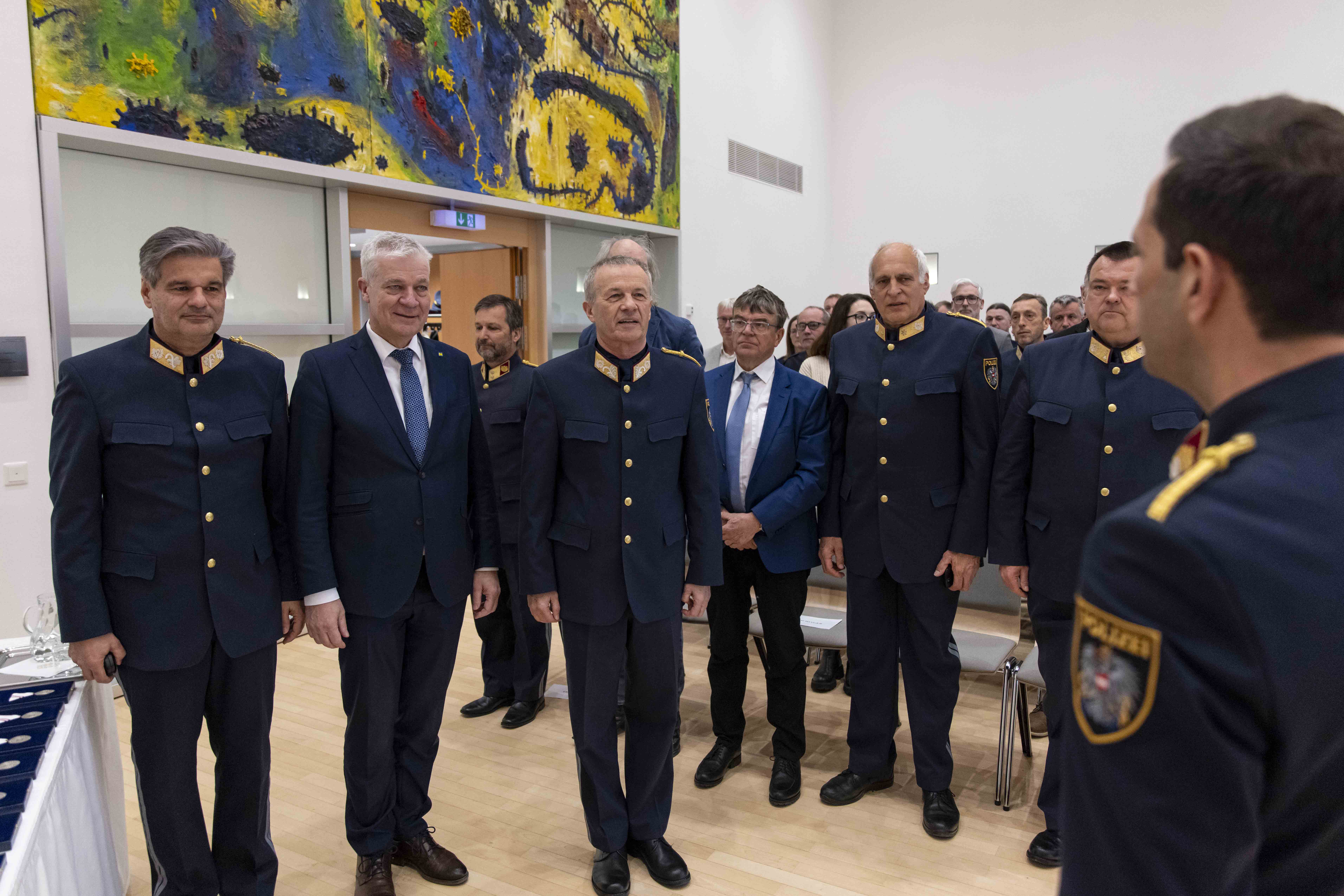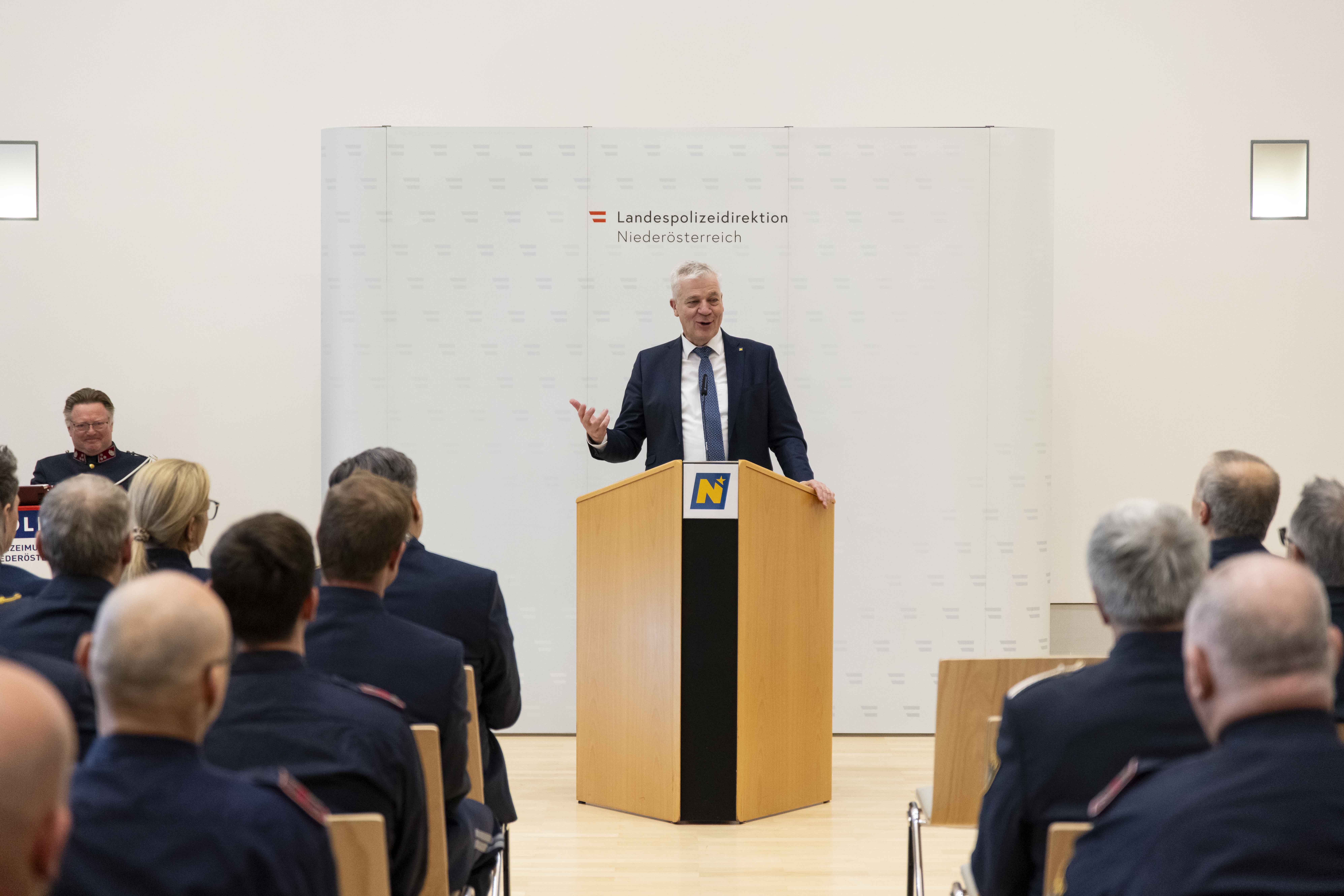 Die Begrüßung der Ehrengäste erfolgte durch Hofrat Michael Renghofer, der die Bedeutung dieser feierlichen Zusammenkunft hervorhob und die anwesenden Gäste willkommen hieß.In seiner Ansprache würdigte Landespolizeidirektor Franz Popp, die Leistungen der Bediensteten und betonte die hohe Einsatzbereitschaft sowie die kontinuierlich gute Arbeit im Dienste der Sicherheit der Bevölkerung. Er verwies zudem auf das große Vertrauen, das der Polizei in der Bevölkerung entgegengebracht wird.Die Grüße von Landeshauptfrau Johanna Mikl-Leitner überbrachte Landesrat Anton Kasser, der den Dank und die Anerkennung des Landes Niederösterreich für die geleistete Arbeit zum Ausdruck brachte und die Bedeutung der Exekutive als wesentliche Säule der Sicherheitsfamilie unterstrich.Im Rahmen des Festakts wurden das Goldene Verdienstzeichen der Republik Österreich an KontrInsp Wilhelm Lechner, KontrInsp Reinhard Fröch und BezInsp Stefan Reiter verliehen. Das Silberne Verdienstzeichen der Republik Österreich erhielt ChefInsp iR Kurt Fenz. Mit dem Anerkennungszeichen wurden RevInsp Bernhard Steghofer und Inspin Sandra Prochazka ausgezeichnet.Die Dankesworte sprach Hofrat Anton Aichinger, der im Namen der Geehrten seine Wertschätzung für die Auszeichnung zum Ausdruck brachte und den Verantwortlichen für die Würdigung dankte.Für die feierliche Umrahmung der Veranstaltung sorgte die Polizeimusik Niederösterreich unter der Leitung von Kapellmeisterin Silvia Jäger.Mit den Landes- und Bundeshymnen sowie einem anschließenden Buffet fand die Veranstaltung in würdigem Rahmen ihren Ausklang.