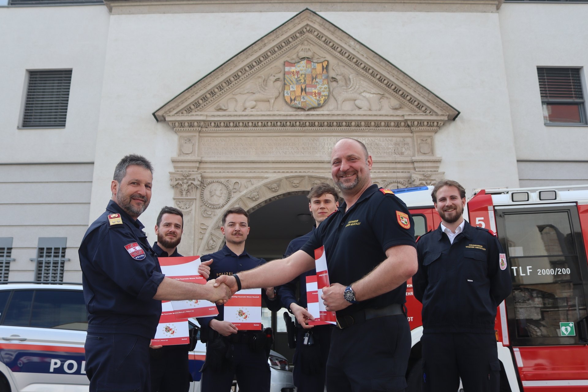 Im Rahmen einer kleinen Zeremonie, an der auch Stadtpolizeikommandant Obstlt Manfred Fries teilnahm, durften den eingesetzten Beamten durch ABI Richard Berger und Kameradschaftsobmann Maximilian Machek-Rückert neben einer Dank- und Anerkennungsurkunde auch Ehrenkarten für den Feuerwehrball am kommenden Samstag überreicht werden.