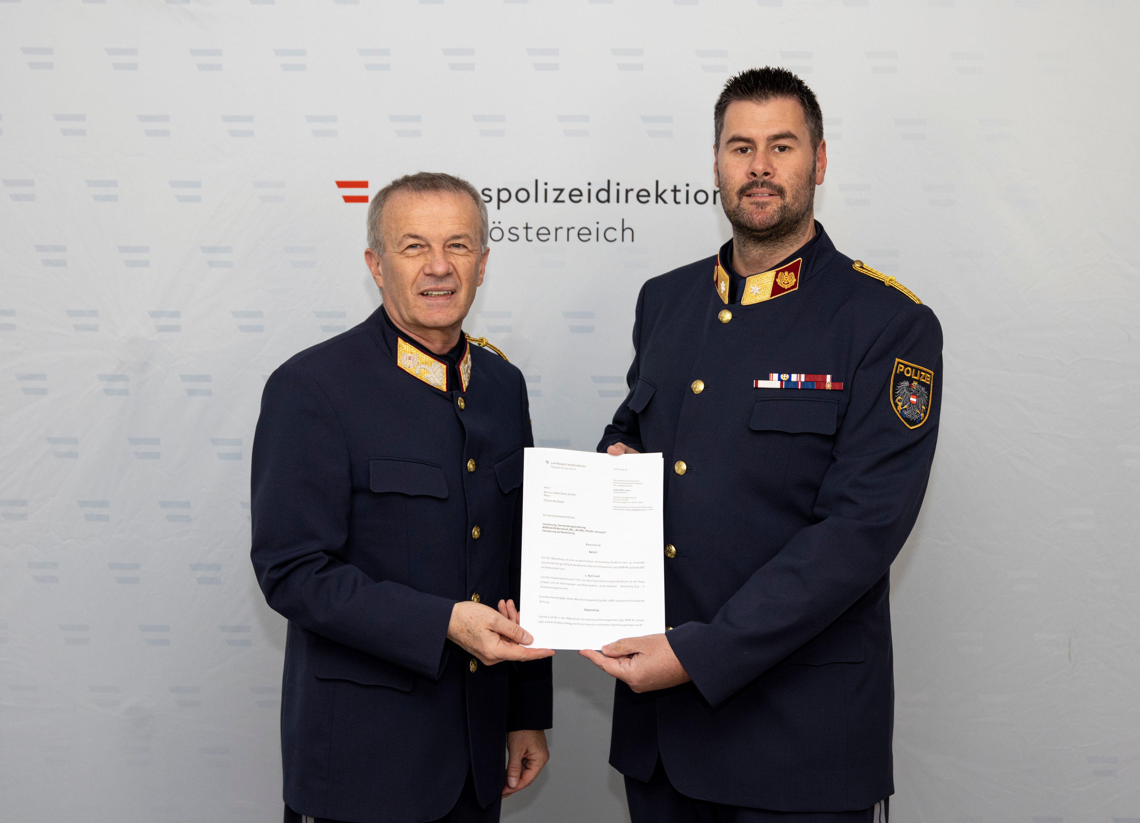 Landespolizeidirektor Franz Popp überreicht Bernhard Birkhahn das Ernennungsdekret zum Bezirkspolizeikommandanten von Waidhofen an der Thaya