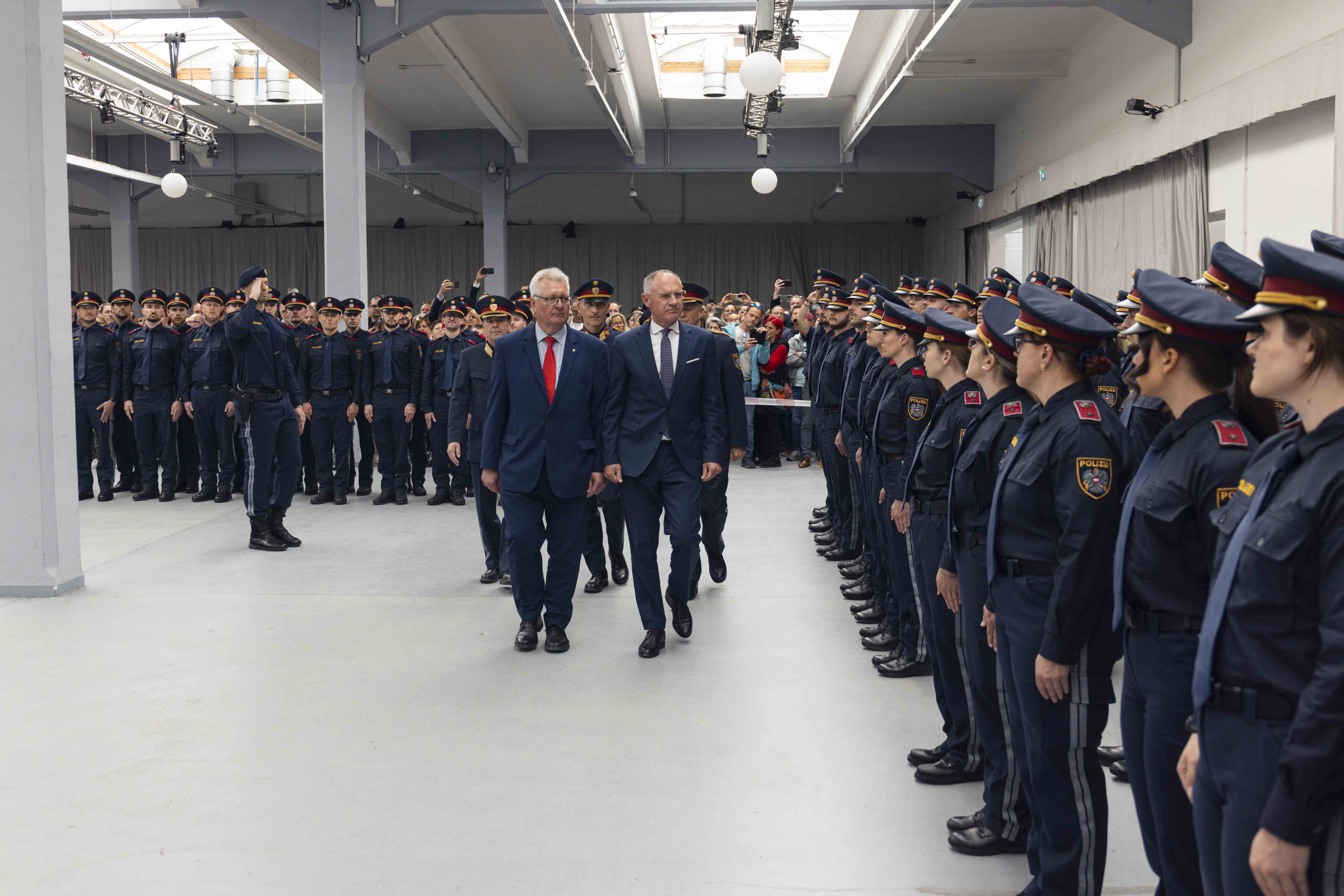 Angelobung und Ausmusterung von 201 neuen Kolleginnen und Kollegen für Niederösterreich im Beisein von Innenminister Gerhard Karner, stellvertretend für die Landeshauptfrau Johanna Mikl-Leitner, der Abgeordnete zum NÖ Landtag Christoph Kainz und Landespolizeidirektor Franz Popp.