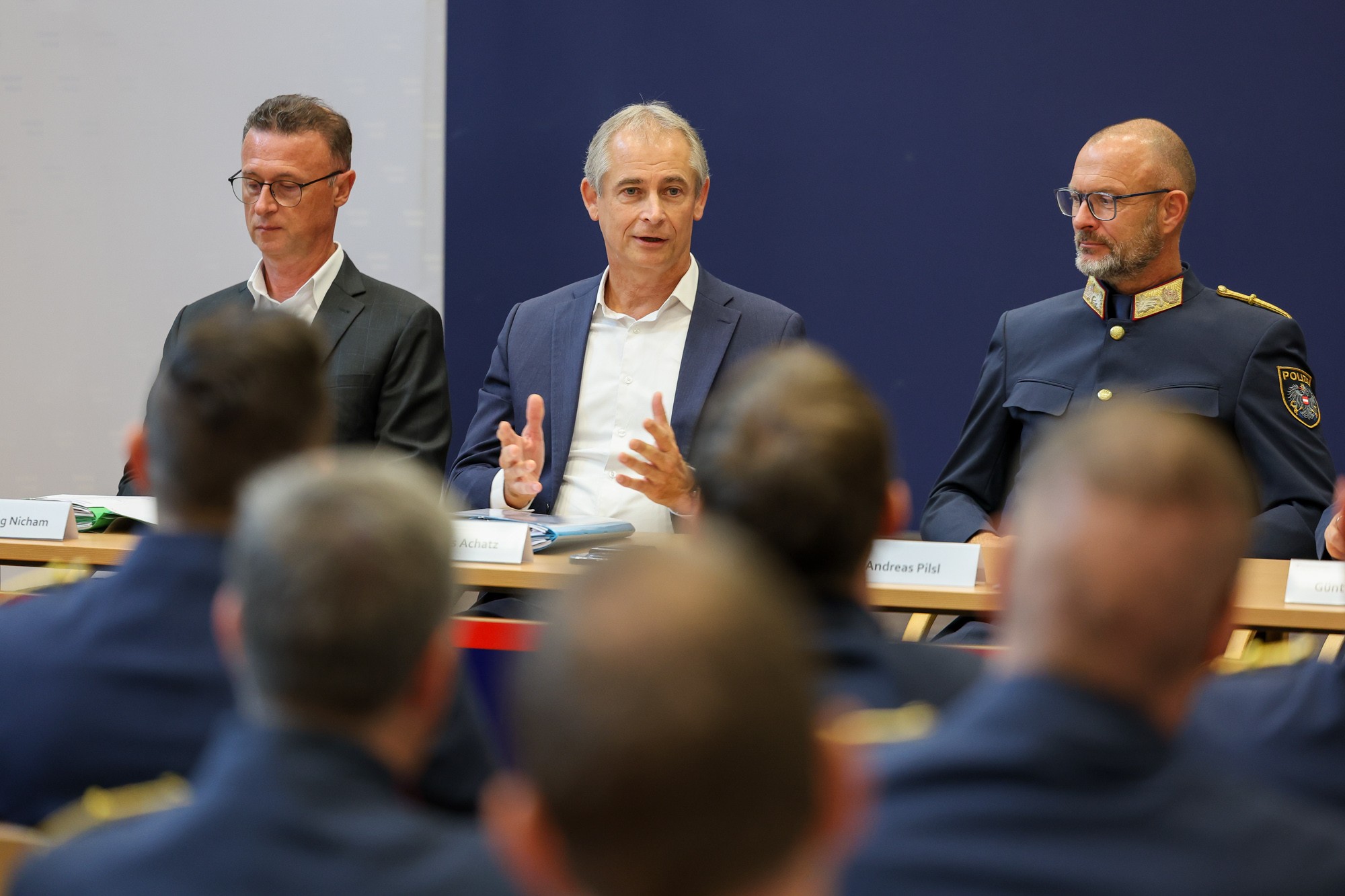 Bei der anschließenden Führungs-Enquete waren sämtliche Bezirks- und Stadtpolizeikommandanten sowie die Büro- und Abteilungsleiter geladen und tauschten sich mit Achatz über die brennenden Themen dieser Zeit aus. So wurde das Thema Budget genauso angesprochen wie der aktuelle Stand im Projekt Dienstzeitmanagement und die damit einhergehende Strukturthematik bei den Dienststellen.