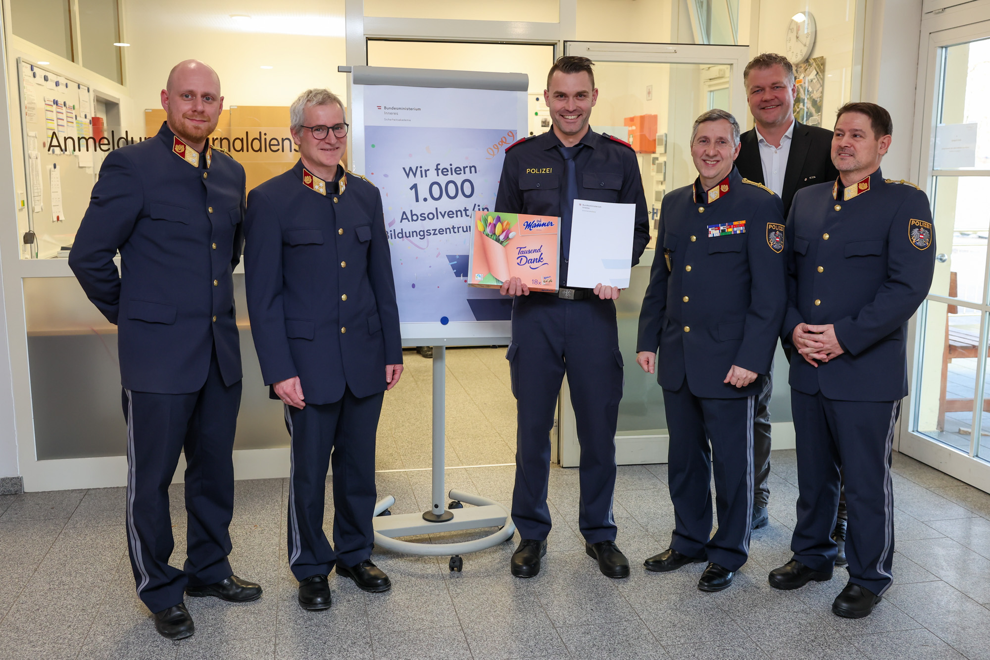 Das Bildungszentrum der Sicherheitsakademie in Wels (BZS) feierte am 27. Jänner 2026 anlässlich der Dienstprüfungen von drei Polizeigrundausbildungslehrgänge den eintausendsten Absolventen. Der Leiter der BZS Wels Christian Stemmer gratulierte dem sichtlich überraschten Aspiranten Philipp H., der sich nunmehr als eintausendster Absolvent bezeichnen darf. Neben Stemmer gratulierten auch die ehemaligen Leiter Karl Sternberger und der jetzige Stadtpolizeikommandant von Wels Stefan Müller.