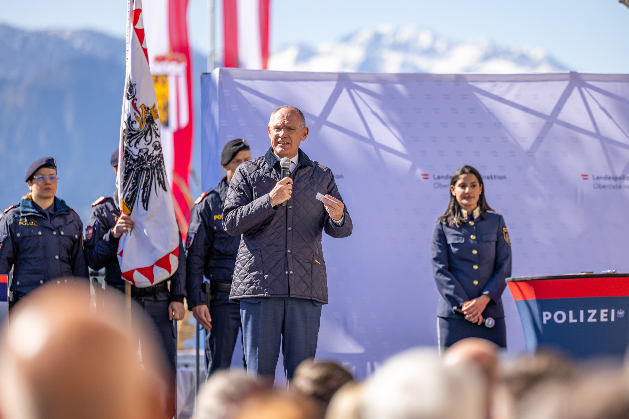 Landeshauptmann Thomas Stelzer betonte in seiner Festrede den hohen Stellenwert des Polizeiberufs: "Wer sich für den Polizeidienst entscheidet, entscheidet sich bewusst für Verantwortung gegenüber den Menschen. Ich danke allen Ausgemusterten für ihre Bereitschaft, für Sicherheit und Ordnung einzustehen – das verdient größten Respekt."