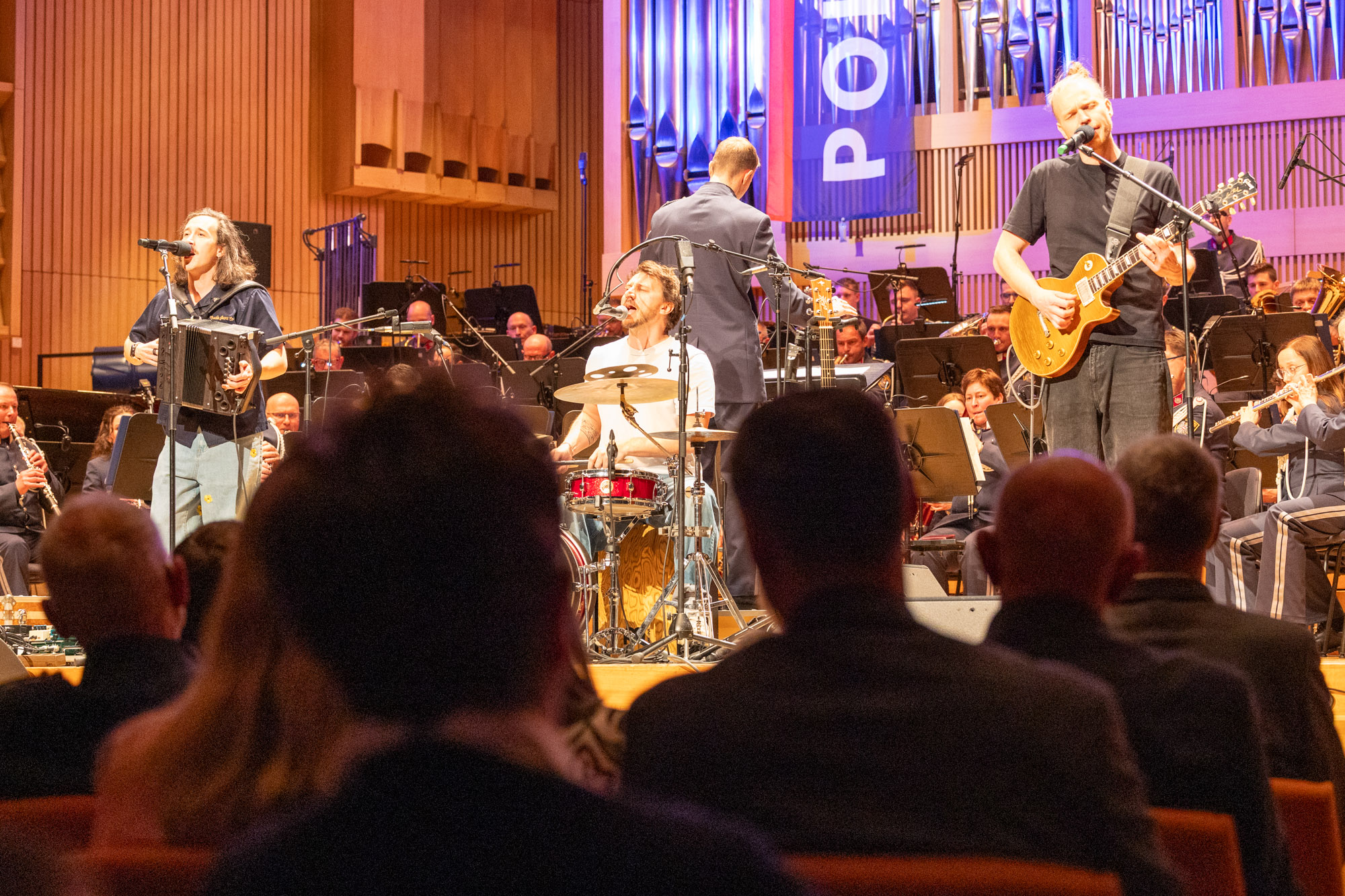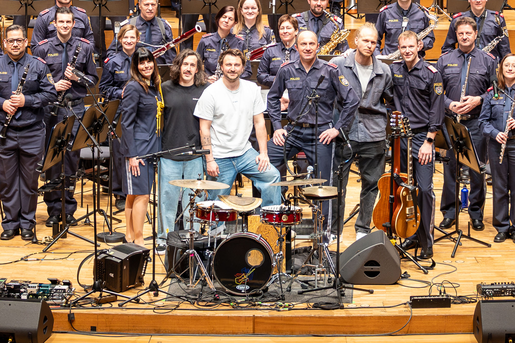 Im zweiten Teil wurde das begeisterte Publikum mit dem Konzertmarsch "Gibraltar", dirigiert und arrangiert von Kapellmeister-Stv. Peter Schimpl, vom Süden der iberischen Halbinsel auf eine Reise ins nördliche Spanien nach Santiago geschickt: mit "Compostela" vom französischen Komponisten Thierry Deleruyelle wurde eine Pilgerreise auf dem Jakobsweg musikalisch nachgezeichnet. Mit "Flow" vom Schweizer Mario Bürki wurde der Höhepunkt des Konzerts eingeleitet: Polizeimusik Oberösterreich feat. Folkshilfe. Mit der aus Oberösterreich stammenden Band der internationalen Spitzenklasse wurde der restlos ausverkaufte große Saal des Brucknerhauses zum Beben gebracht. Gemeinsam wurden die Top-Songs "Schena Mensch", "Weit weg" und "Hau di her" aufgeführt und das Publikum regelrecht von den Sitzen gerissen.