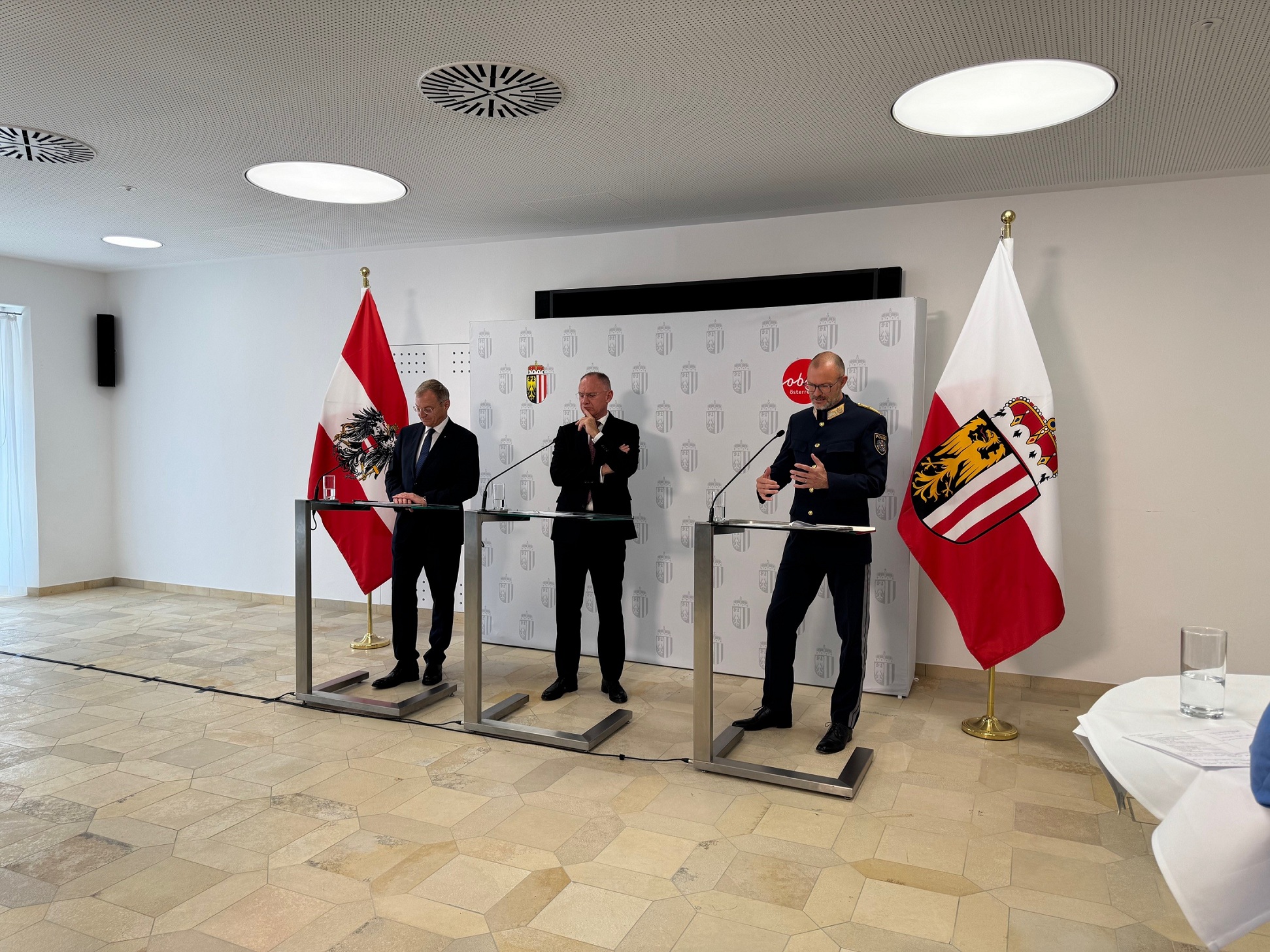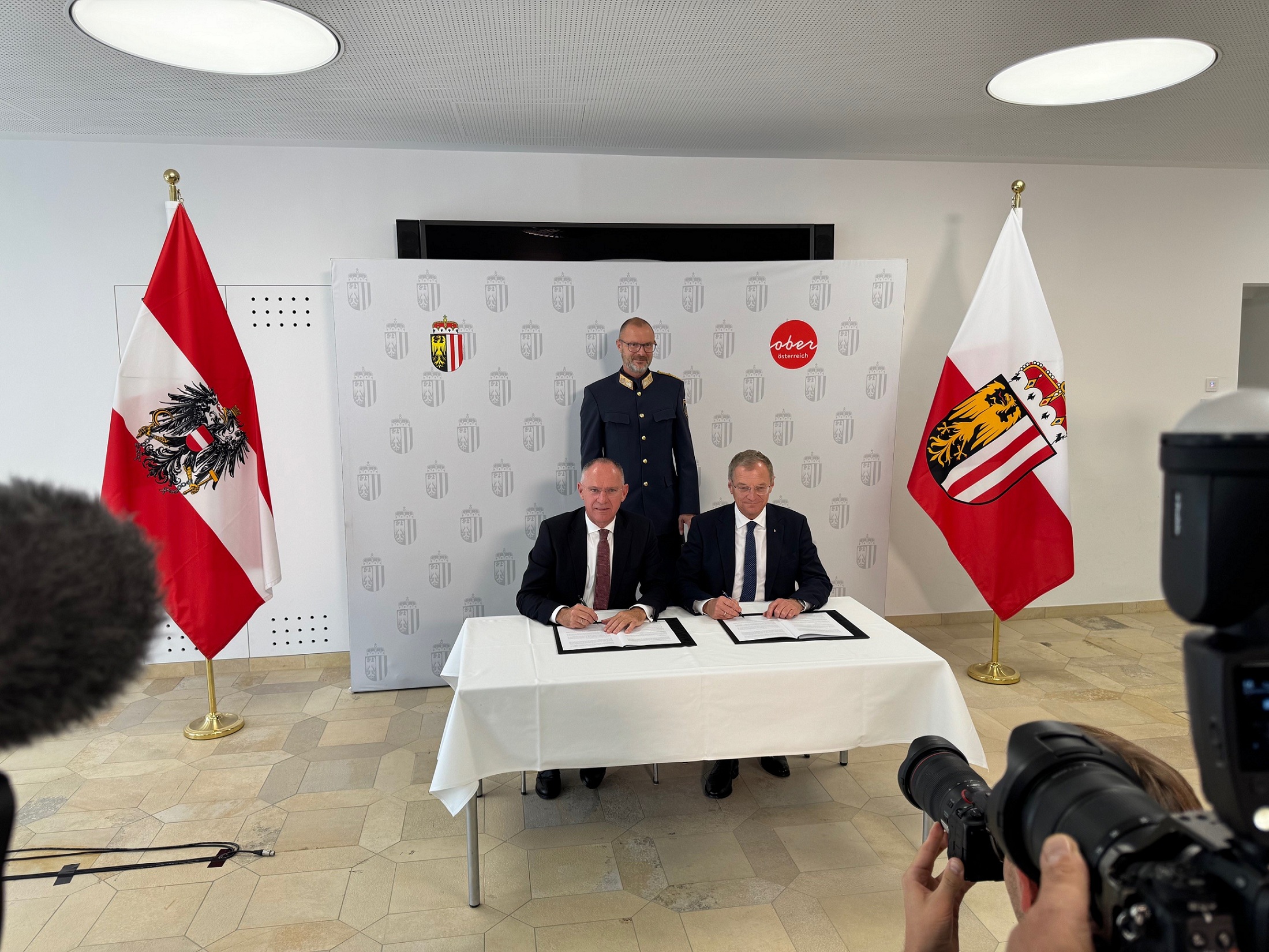 Innenminister Gerhard Karner, Landeshauptmann Thomas Stelzer und Landespolizeidirektor Andreas Pilsl unterzeichneten am 30. September 2025 eine Erneuerung der Sicherheitsvereinbarung zwischen dem Bundesministerium für Inneres und dem Land Oberösterreich.