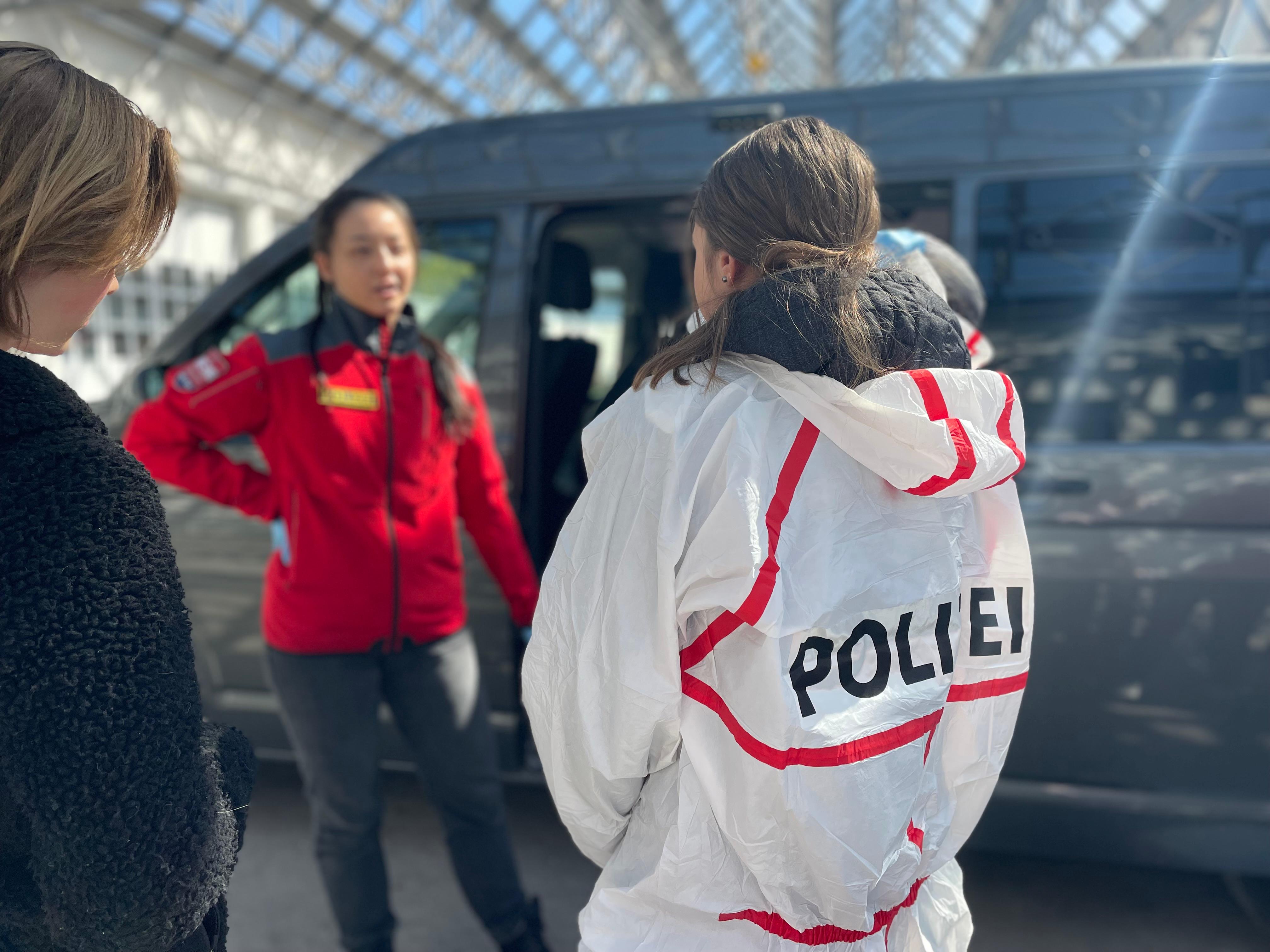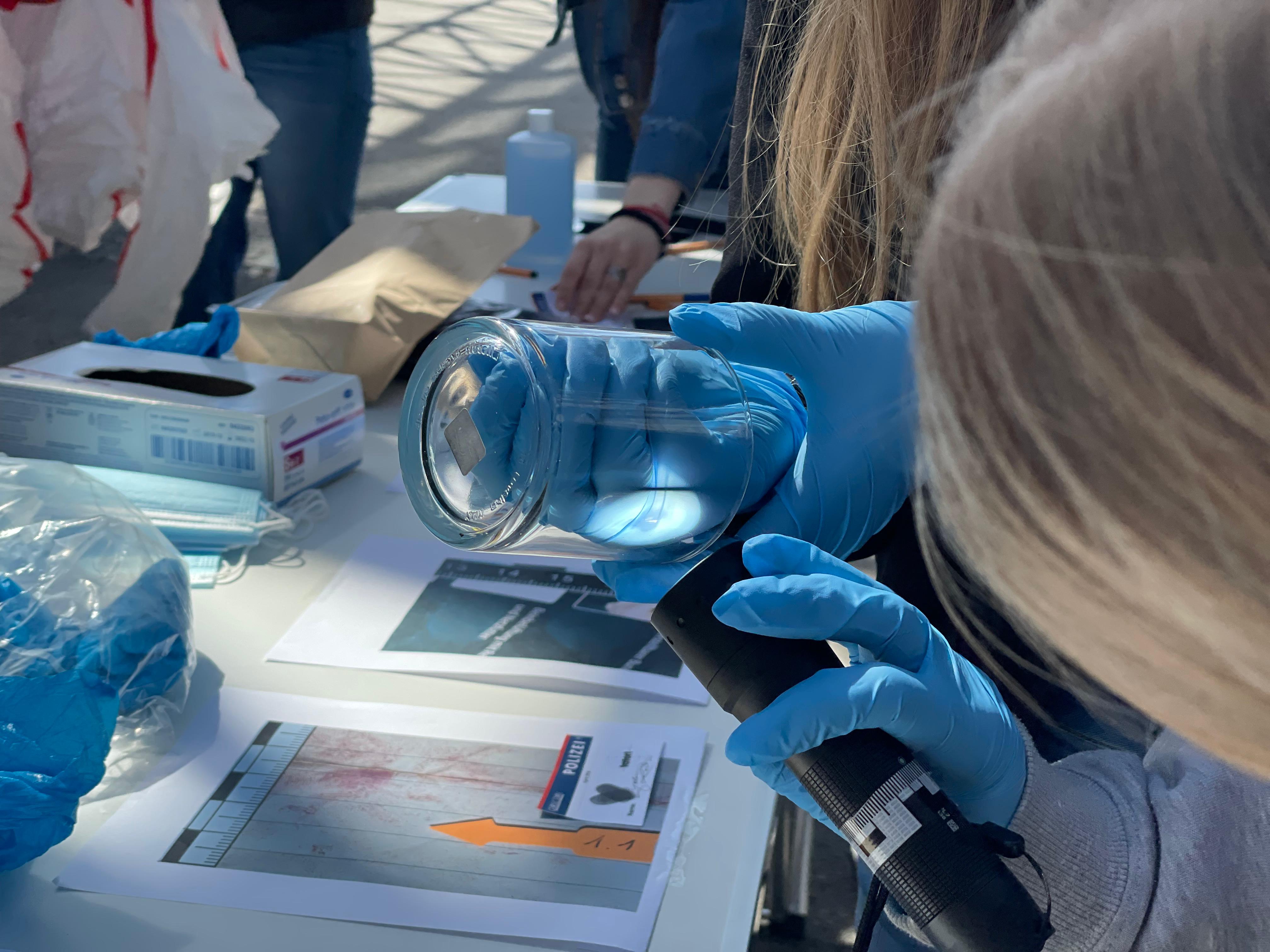 Die Besucherinnen konnten verschiedene Ausrüstungsgegenstände aus nächster Nähe in Augenschein nehmen und unter anderem Spezialausrüstung, einschließlich Schutzhelm, selbst ausprobieren. Zwei junge Tatortbeamtinnen erläuterten anschaulich, wie Schuhspuren, Fingerabdrücke und DNA am Tatort gesichert werden und worauf bei der Spurensicherung besonders zu achten ist. Im Zuge der praktischen Stationen nahmen die Mädchen selbst Fingerabdrücke ab und probierten den Tatortanzug an.