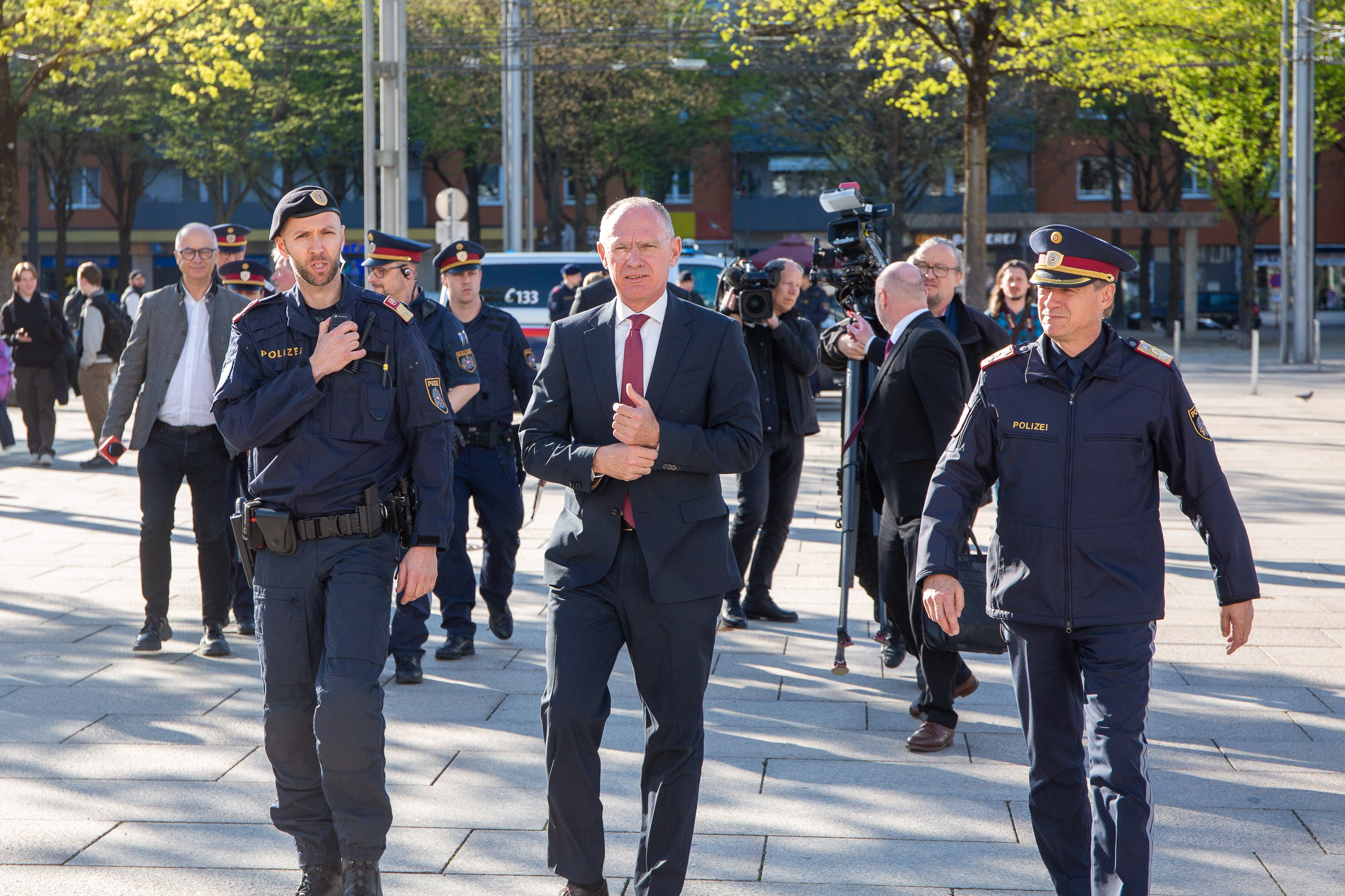 Innenminister Gerhard Karner und Landespolizeidirektor Bernhard Rausch verschafften sich am 7. April 2026 während eines fremdenpolizeilichen Planquadrats rund um den Salzburger Hauptbahnhof persönlich ein Bild von der Arbeit der Polizistinnen und Polizisten.