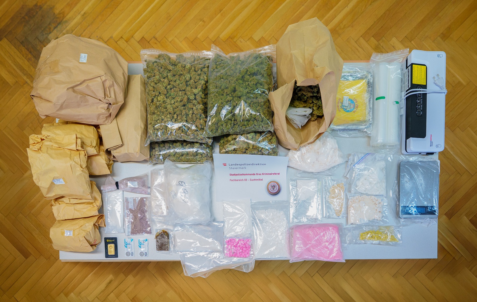 Im Zuge der Festnahme in Slowenien stellten die Beamten zudem ein umfangreiches Lager mit mehreren Kilogramm diverser synthetischer Drogen, Heroin und Kokain sicher.