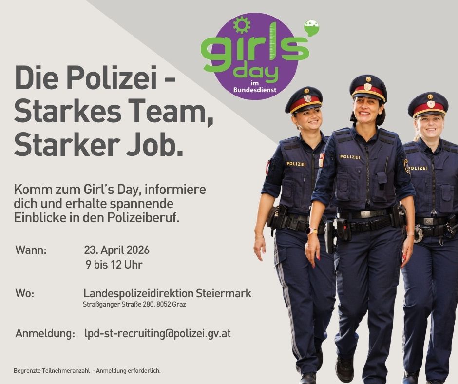 Die Polizei bietet eine große Bandbreite an Möglichkeiten und ist in den vergangenen Jahren zu einem attraktiven Beruf für Frauen geworden. Am Girls' Day gibt die Landespolizeidirektion Steiermark jungen Mädchen ab 14 Jahren sowie Frauen jeden Alters die Möglichkeit, einen Blick in den Polizeiberuf zu werfen.