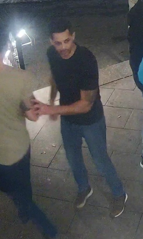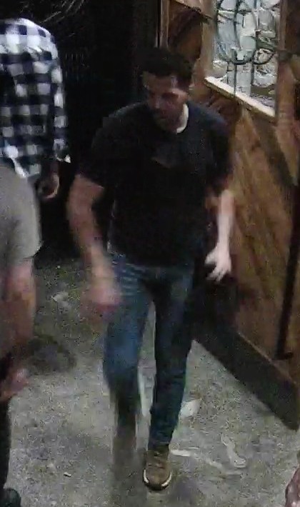 - Männlich, ca. 180 cm, schlank, schwarze Haare, kurzer Bart, braunes Kurzarmshirt, schwarze Hose, schwarze Sneaker