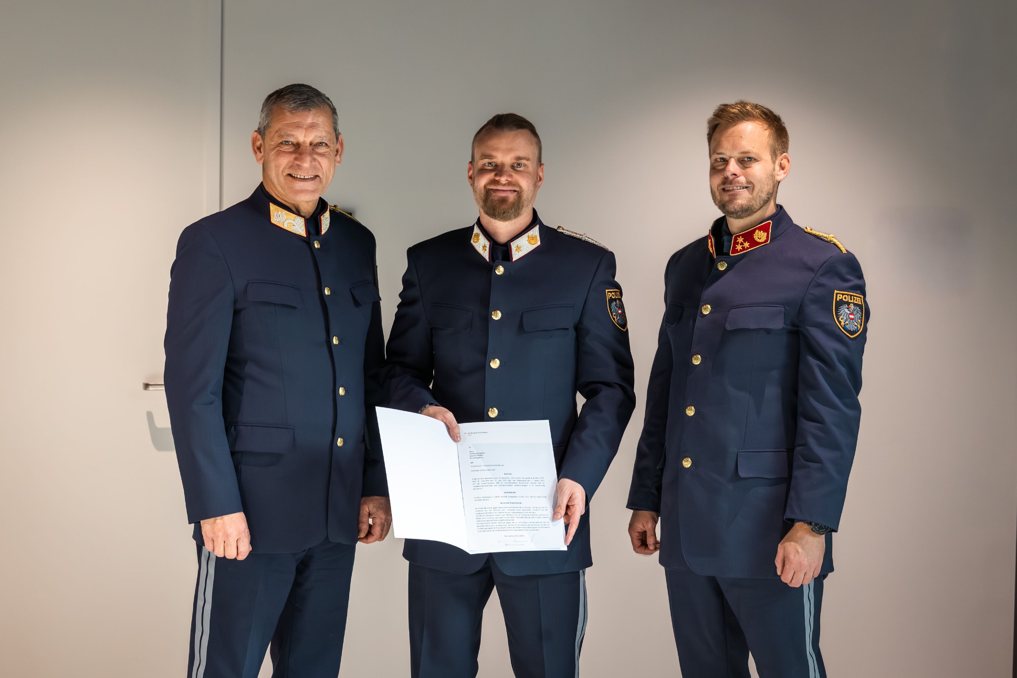 Landespolizeidirektor HR Mag. Helmut Tomac nahm am 23. Dezember 2025 im Beisein des stellvertretenden Bezirkspolizeikommandanten von Kufstein, Hauptmann Christoph Moser, die Ausfolgung der Bestellungsdekrete vor und gratulierte dem Beamten zu seiner verantwortungsvollen Führungsaufgabe.