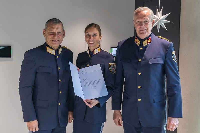 Landespolizeidirektor Helmut Tomac nahm am 1. Dezember 2025 im Beisein des Bezirkspolizeikommandanten des Bezirkes Innsbruck Land, Gerhard Niederwieser, die Ausfolgung des Bestellungsdekretes vor und gratulierte der jungen Beamtin, die erst im Jahr 2015 in den Polizeidienst eintrat, zu ihrer verantwortungsvollen Führungsaufgabe.