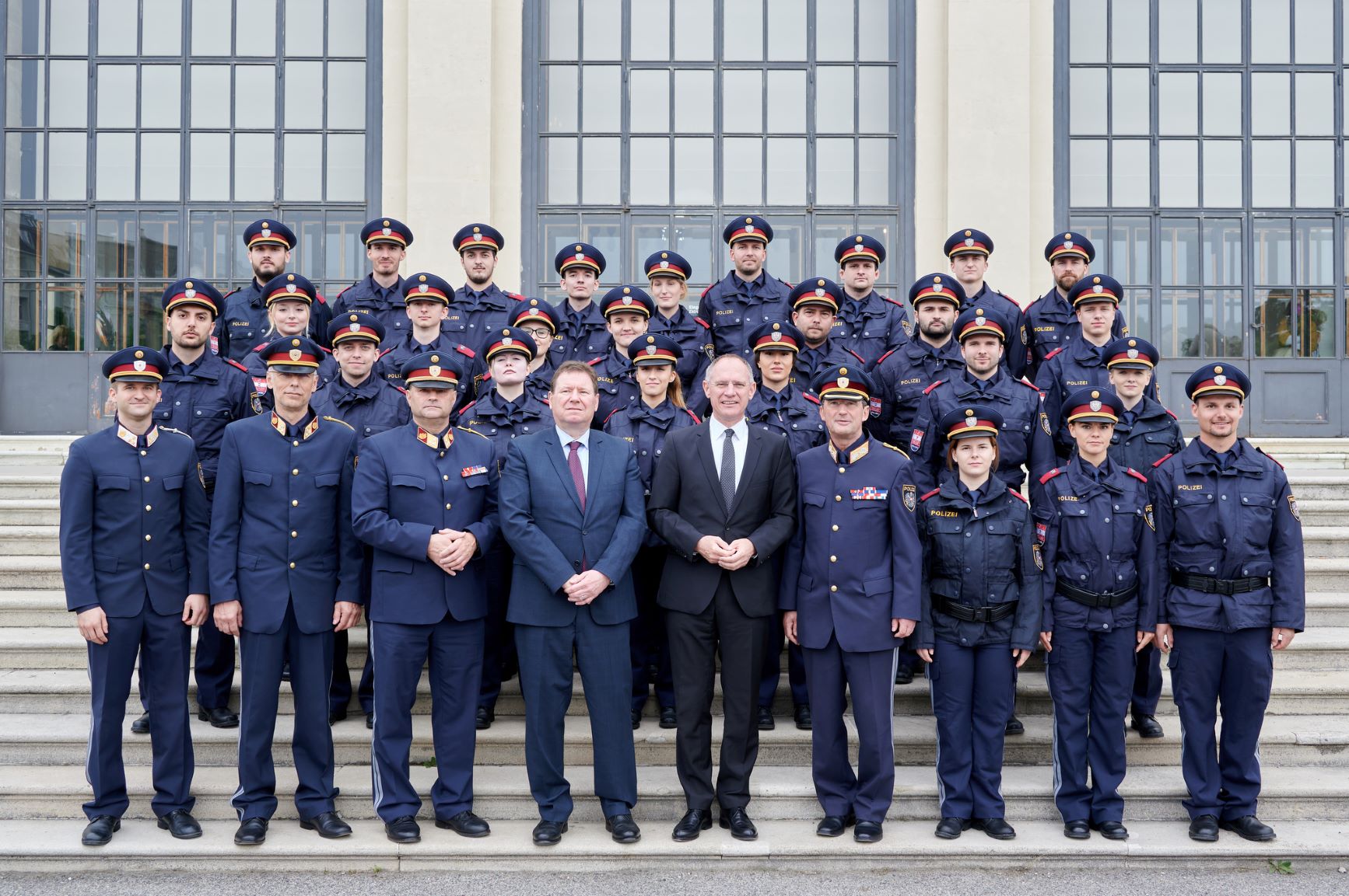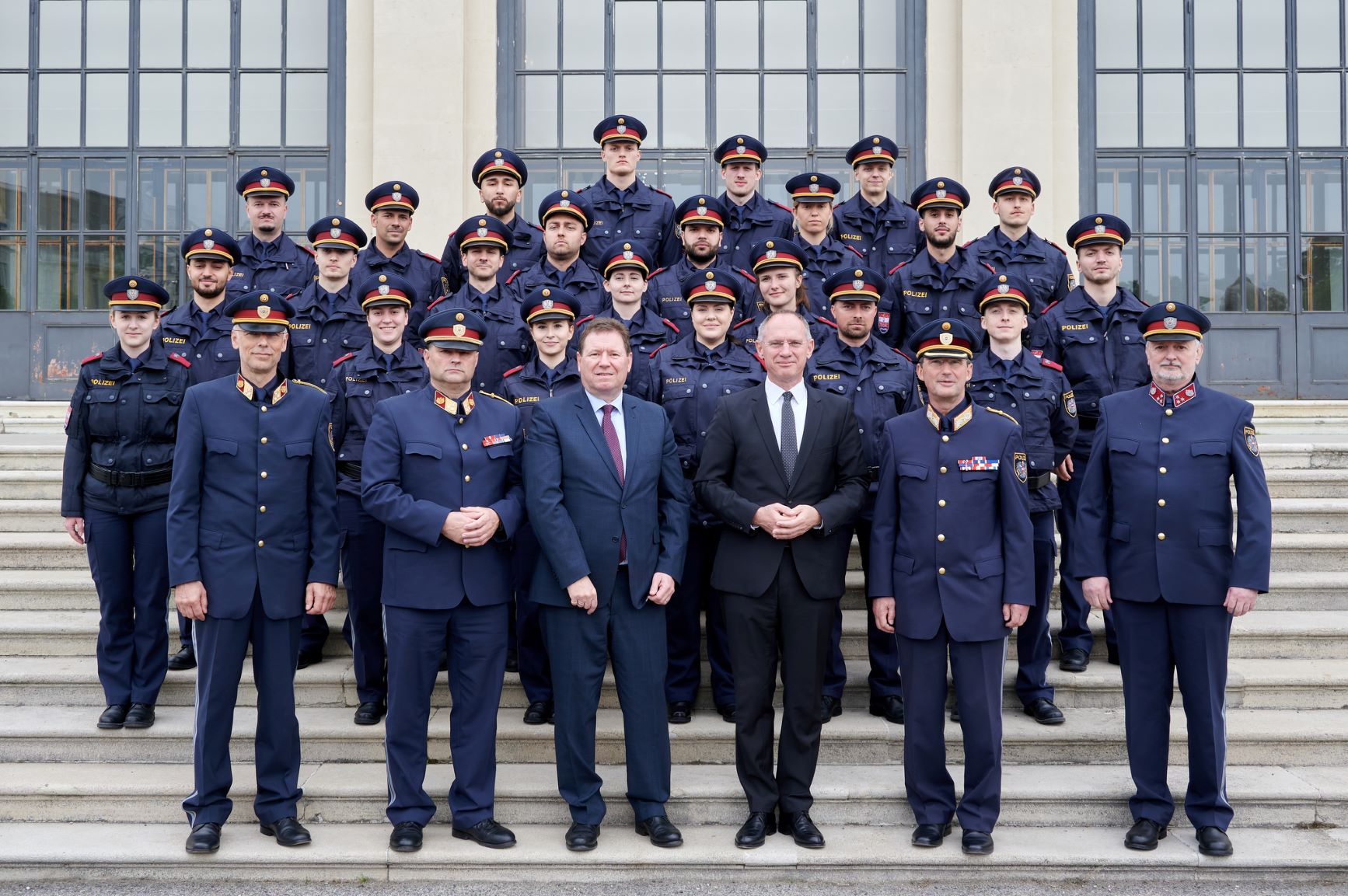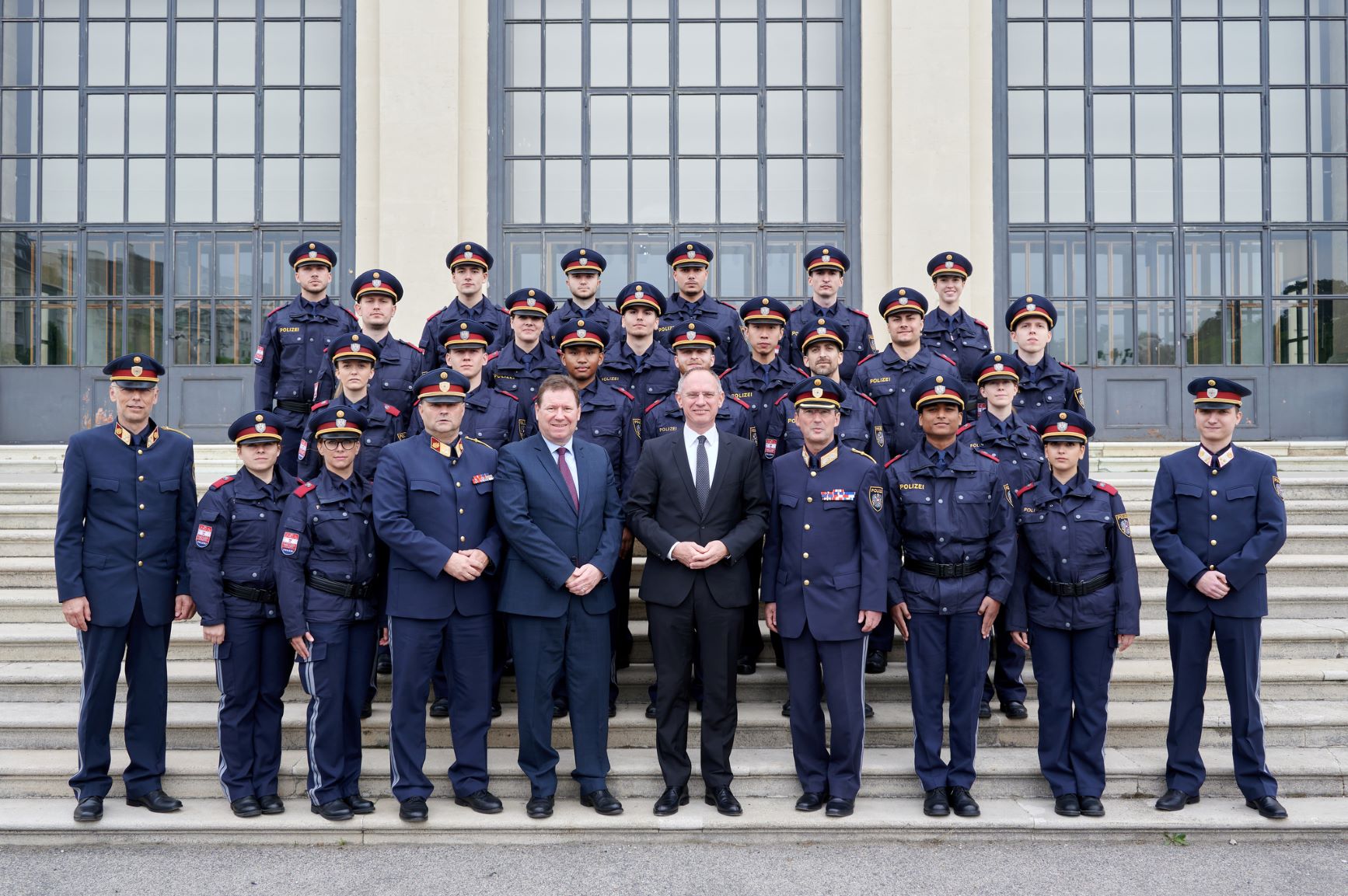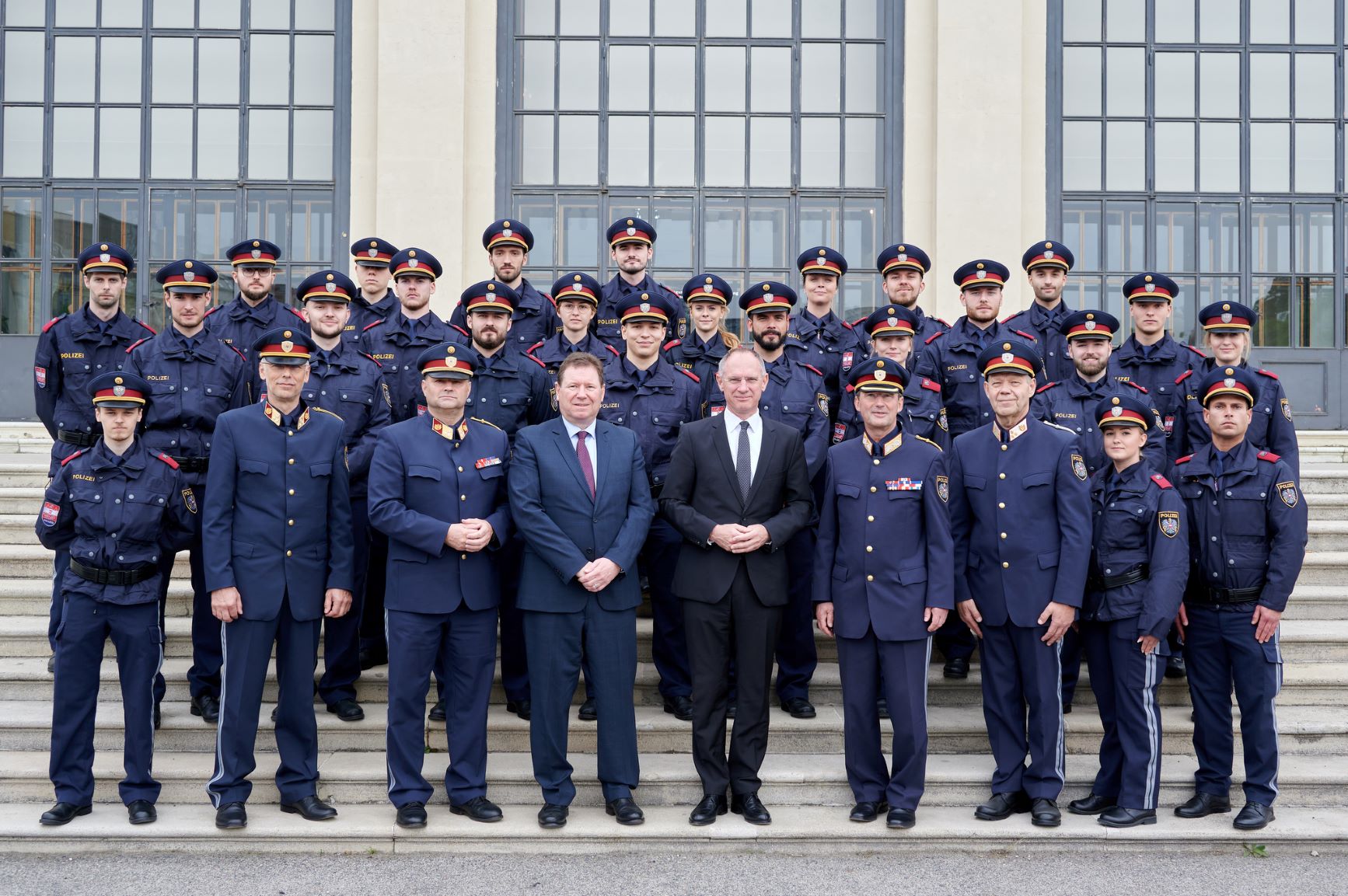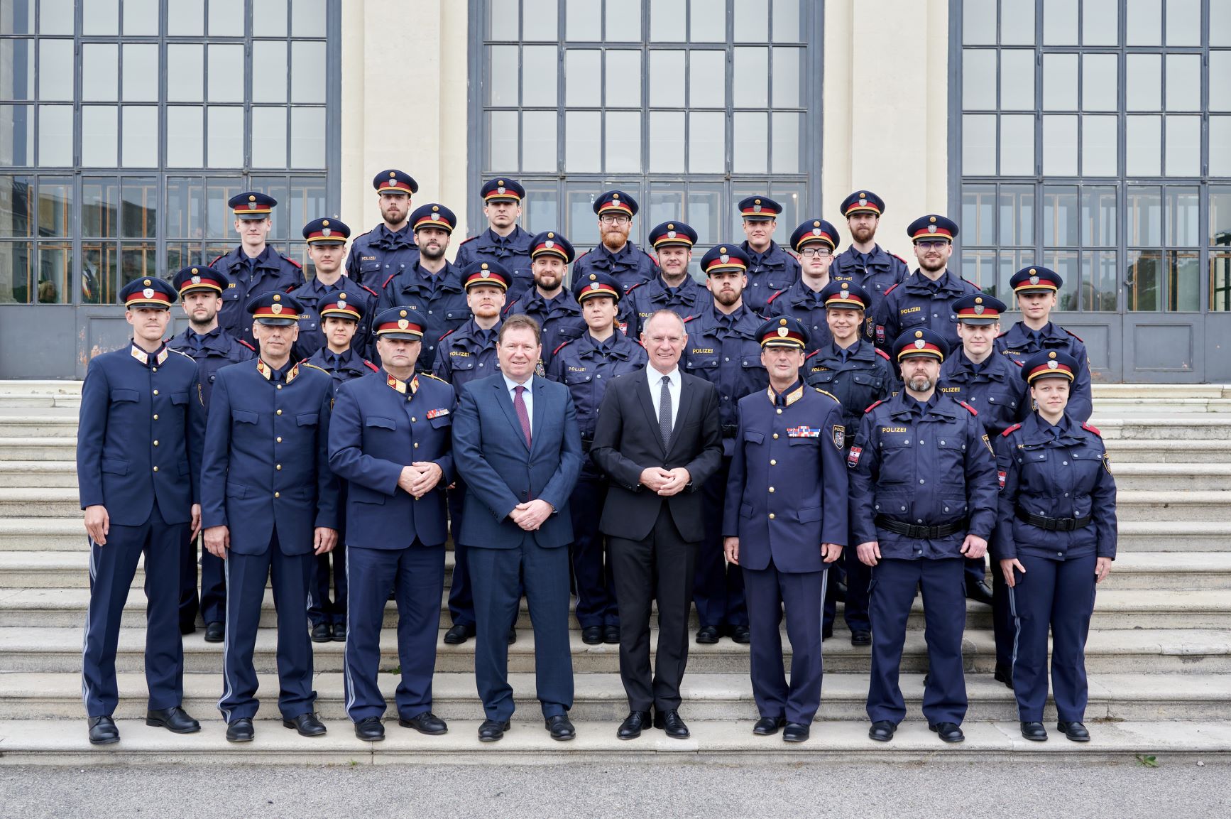 Bundesminister für Inneres Mag. Gerhard Karner, der Vertreter der Stadt Wien Landesabgeordneter und Gemeinderat Christian Hursky und der Landespolizeipräsidenten in Wien Dr. Gerhard Pürstl wünschten den Absolventinnen und Absolventen alles Gute für ihren neuen dienstlichen Weg.