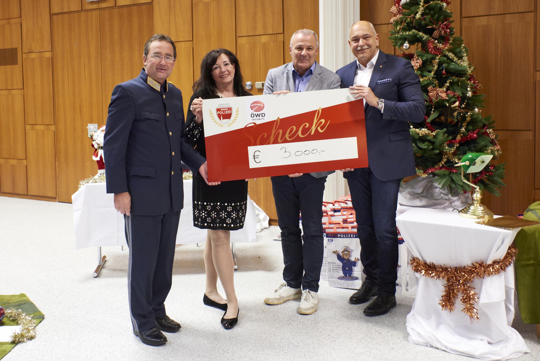 Anschließend hat der Landespolizeipräsident mit den Ehrengästen der gestrigen Veranstaltung, der Generalsekretärin des Vereins der Freunde der Wiener Polizei Erika Gramann-Bettstein, und dem Direktor des ÖWD Security & Services Alexander Kiss dem Leiter des SOS-Kinderdorf Wien Erwin Roßmann einen Scheck über 3.000 Euro übergeben.