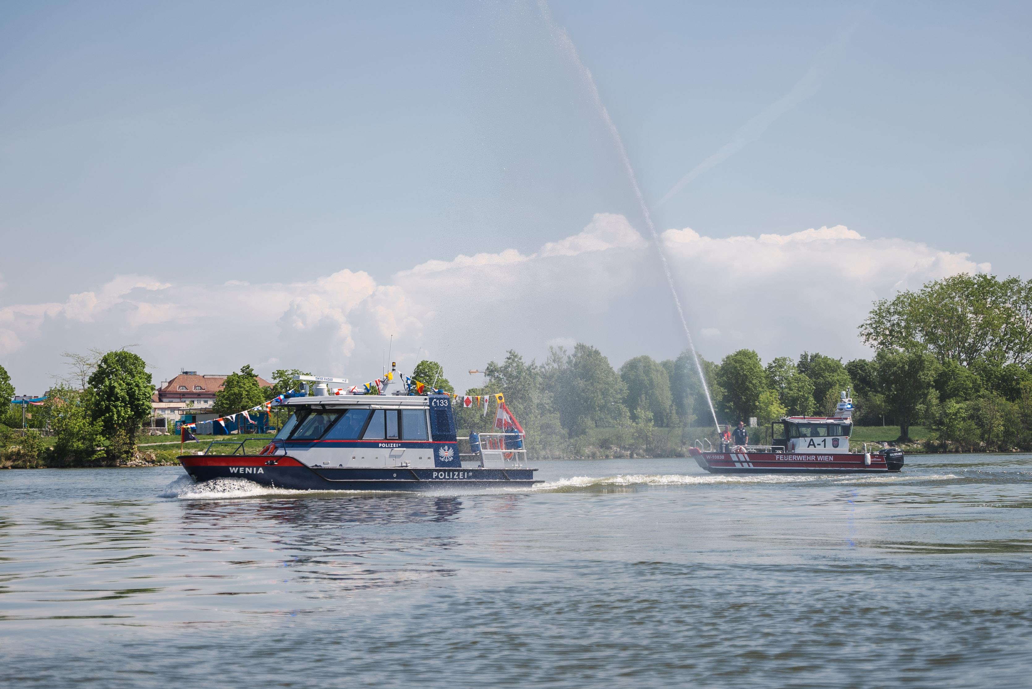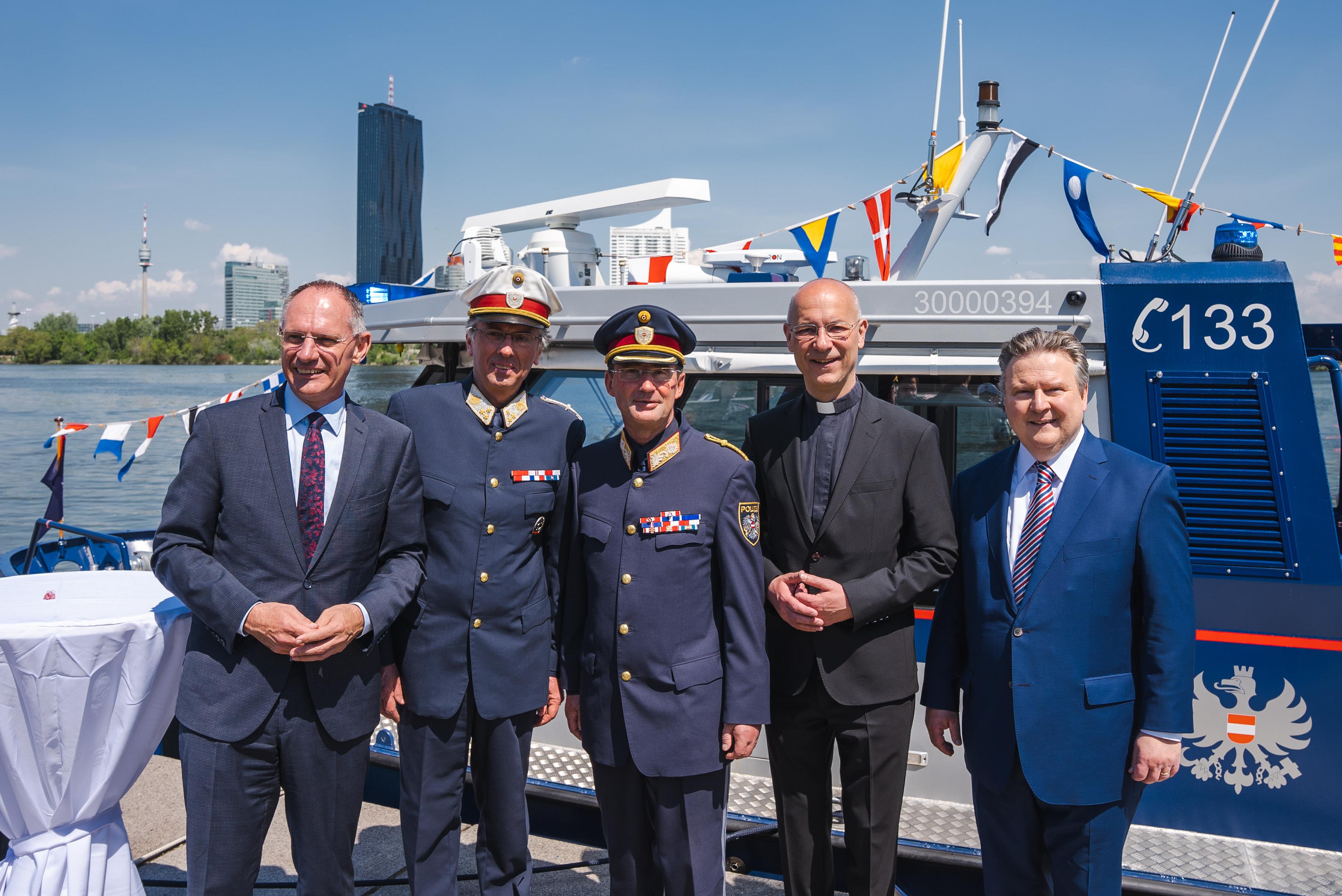 Der Bundesminister für Inneres Mag. Gerhard Karner, der Landespolizeipräsident Dr. Gerhard Pürstl sowie der Wiener Bürgermeister Dr. Michael Ludwig, auch Taufpate des Bootes, hoben in ihren Reden die hervorragende und wichtige Arbeit der Wasserpolizei hervor.